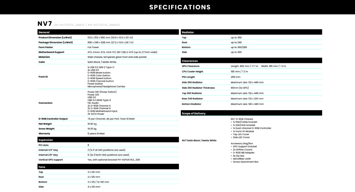 บอกเลยว่าการกลับมาครั้งนี้ของ PHANTEKS ไม่ธรรมดาแน่นอน เพราะนอกจากจะนำสินค้ายอดนิยมกลับมาจำหน่ายแล้ว รอบนี้มาพร้อมสินค้าใหม่เอาใจสาวก PHANTEKS อีกด้วย ซึ่งแน่นอนว่าหากพูดถึงแบรนด์ PHANTEKS นั้นขึ้นชื่อว่าเป็นแบรนด์ที่ผลิตเคสมีที่คุณภาพ ไม่ว่าเป็นวัสดุที่ใช้ รวมถึงการออกแบบที่ใส่ใจในทุก ๆ รายละเอียด และได้รับความนิยมเป็นอย่างมากในผู้ใช้งานคอมพิวเตอร์แบรนด์ไฮเอนด์ PHANTEKS NV7 เป็นเคสขนาด Full Tower ที่ขนาดค่อนข้างใหญ่ ด้านหน้า และด้านข้างเป็นกระจกมองเห็นอุปกรณ์ภายในได้ชัดเจน บริเวณรอบเมนบอร์ดมีไฟ D -RGB STRIP เพื่อเพิ่มความโดดเด่น มาพร้อมตัวยึดพัดลม,หม้อน้ำในตัว ,ฝาครอบสายไฟ LED ,ฝาครอบการไหลของอากาศ และชุดเครื่องมือจัดการสายเคเบิลที่ไม่เหมือนใครทำให้ NV7 ทุกรุ่นโดดเด่นกว่ารุ่นอื่น ๆ และรองรับพัดลมได้สูงสุดถึง 12 ตัว ทำให้มั่นใจได้ว่า NV7 พร้อมสำหรับทุกความท้าทายของคุณอย่างแน่นอน