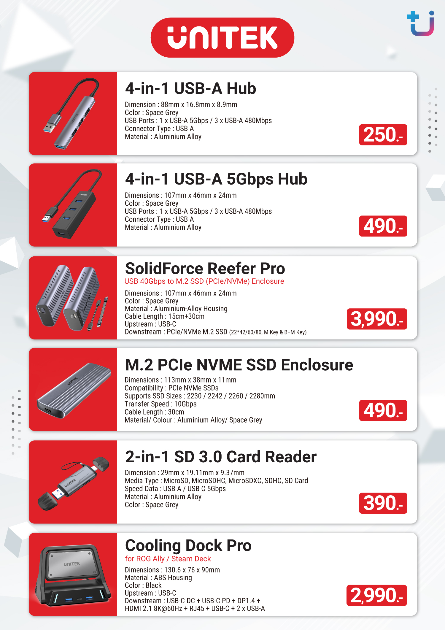 และ USB Hub สำหรับการเพิ่มจำนวนพอร์ตเชื่อมต่อ UNITEK ได้ออกแบบให้มีการใช้งานที่หลากหลาย เช่น แท่นวางแล็ปท็อปพร้อม USB Hub แท่นสำหรับเชื่อมต่อปล่อยสัญญาณผ่านเครื่อง Handheld สำหรับเชื่อมต่อและปล่อยสัญญาณภาพพร้อมกับระบายความร้อน เป็นต้น