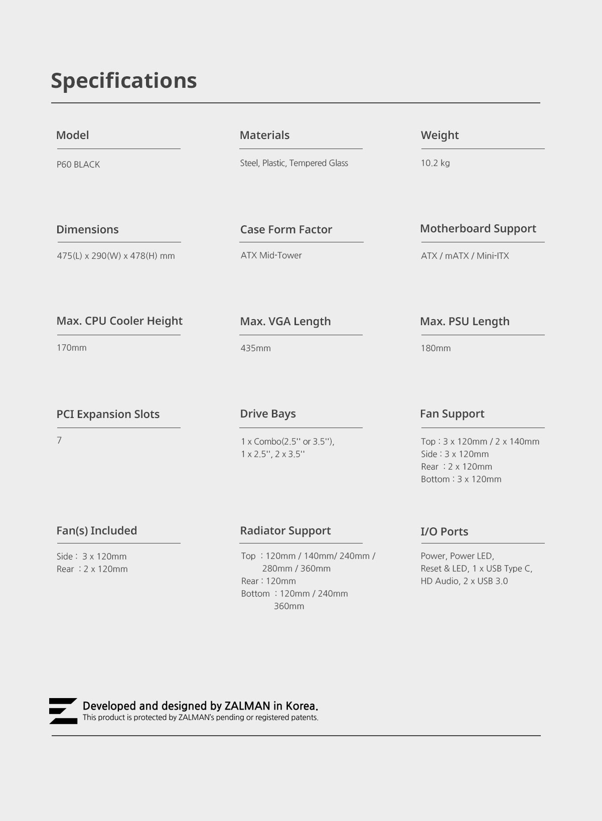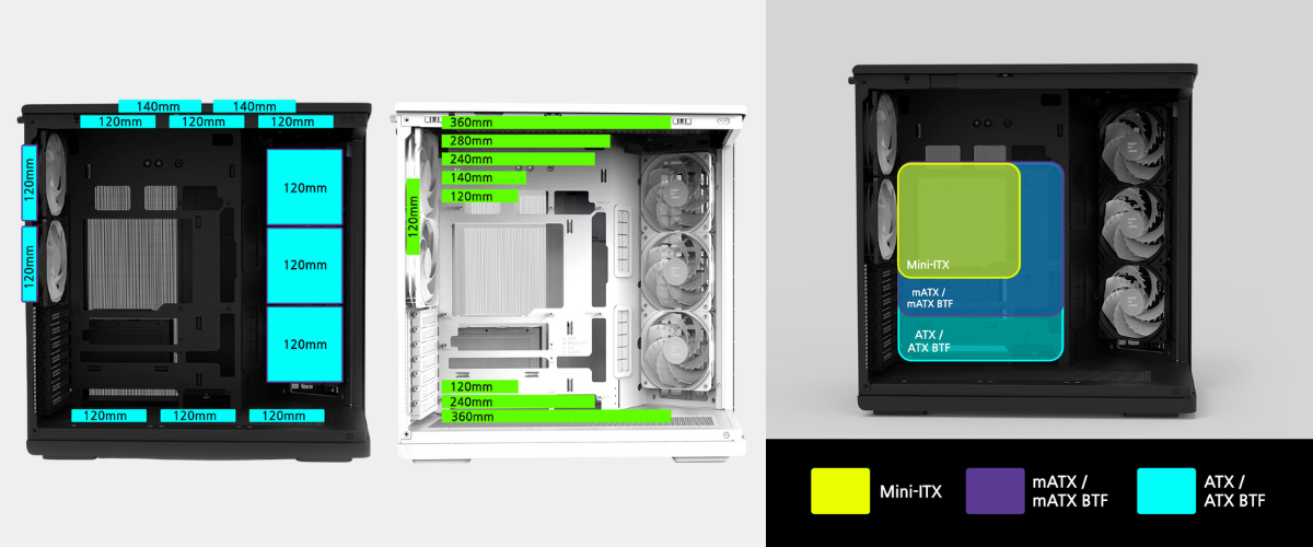 ZALMAN P60 ออกแบบมาเพื่อรองรับขุมพลังยุคใหม่ได้อย่างครอบคลุม โดยมาพร้อมพัดลม ZM-AF120 ARGB PWM ติดตั้งมาให้ทันทีถึง 5 ตัว (ด้านข้าง 3 ตัว และด้านหลัง 2 ตัว) ซึ่งเป็นดีไซน์แบบ Dual Rear Exhaust ช่วยดึงความร้อนออกจากระบบได้รวดเร็วกว่าเคสทั่วไป ตัวเคสรองรับการติดตั้งพัดลมได้สูงสุดถึง 11 ตัว (บน 3, ข้าง 3, หลัง 2, ล่าง 3) และรองรับการติดตั้งหม้อน้ำชุดน้ำปิดได้สูงสุดขนาด 360mm ทั้งในด้านบนและด้านล่าง สำหรับการรองรับเมนบอร์ดนั้น ZALMAN P60 ออกแบบมาให้ยืดหยุ่นสูง สามารถติดตั้งได้ตั้งแต่ขนาด ATX, Micro-ATX ไปจนถึง Mini-ITX ตอบโจทย์ทุกการจัดสเปคคอมพิวเตอร์ รวมถึงรองรับเมนบอร์ดแบบ Back Connector Motherboards ของแบรนด์ ASUS BTF หรือ MSI Project Zero