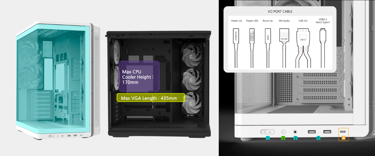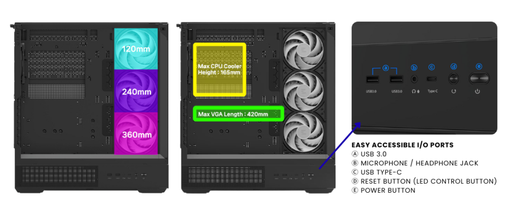 โดดเด่นด้วยการติดตั้งพัดลม ARGB มาให้ถึง 4 ตัว โดยมีไฮไลท์อยู่ที่พัดลมด้านข้างแบบ Reverse Blade ที่ช่วยให้การดูดลมเข้าเคสยังคงโชว์ความสวยงามของใบพัดและแสงไฟได้อย่างสมบูรณ์แบบ ภายในกว้างขวางรองรับการติดตั้งหม้อน้ำระบายความร้อนขนาดใหญ่ 360mm ที่ด้านข้าง และรองรับการ์ดจอระดับไฮเอนด์ได้ยาวสูงสุดถึง 420mm พร้อมตอบโจทย์การใช้งานยุคใหม่ด้วยพอร์ตเชื่อมต่อที่ครบครันทั้ง USB Type-C, USB 3.0 และระบบจัดการสายไฟที่ออกแบบมาให้จัดเก็บได้อย่างง่ายดายและเป็นระเบียบ
