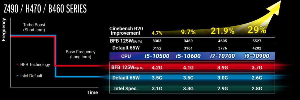 27 พฤษภาคม 2563 – ASRock เปิดตัวเมนบอร์ด Z400 series สำหรับผู้ใช้ซีพียู Intel Core Gen10 ด้วยคุณสมบัติมากมายบนเมนบอร์ด เพื่อตอบสนองการใช้งานในกลุ่มต่างๆ ได้อย่างเต็มที่ และล่าสุดกับเทคโนโลยี BFB หรือ Base Frequency Boost ที่ให้ผู้ใช้สามารถเพิ่มความเร็วบนซีพียูที่ล็อคตัวคูณ กับการใช้งานร่วมกับซีพียู Intel ที่เป็นแบบ Non-K ในรุ่นต่างๆ ด้วยการเพิ่มสัญญาณนาฬิกาพื้นฐานได้บนเมนบอร์ด ASRock 300 และ 400 series ได้ทันที แม้จะไม่ใช่เมนบอร์ดที่เป็น Z series ก็ตาม