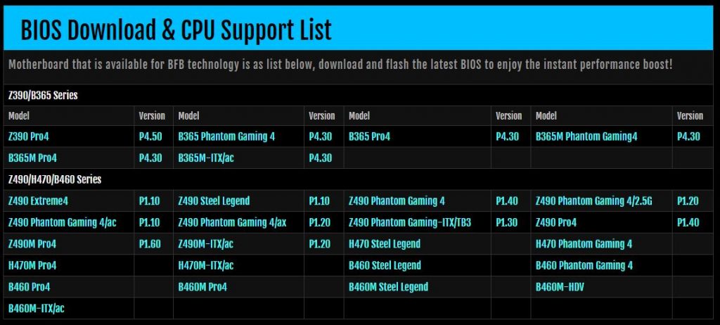 รายการเมนบอร์ดที่รองรับเทคโนโลยี BFB สามารถดาวน์โหลดและแฟลชไบออสล่าสุด เพื่อเพิ่มประสิทธิภาพได้ทันที