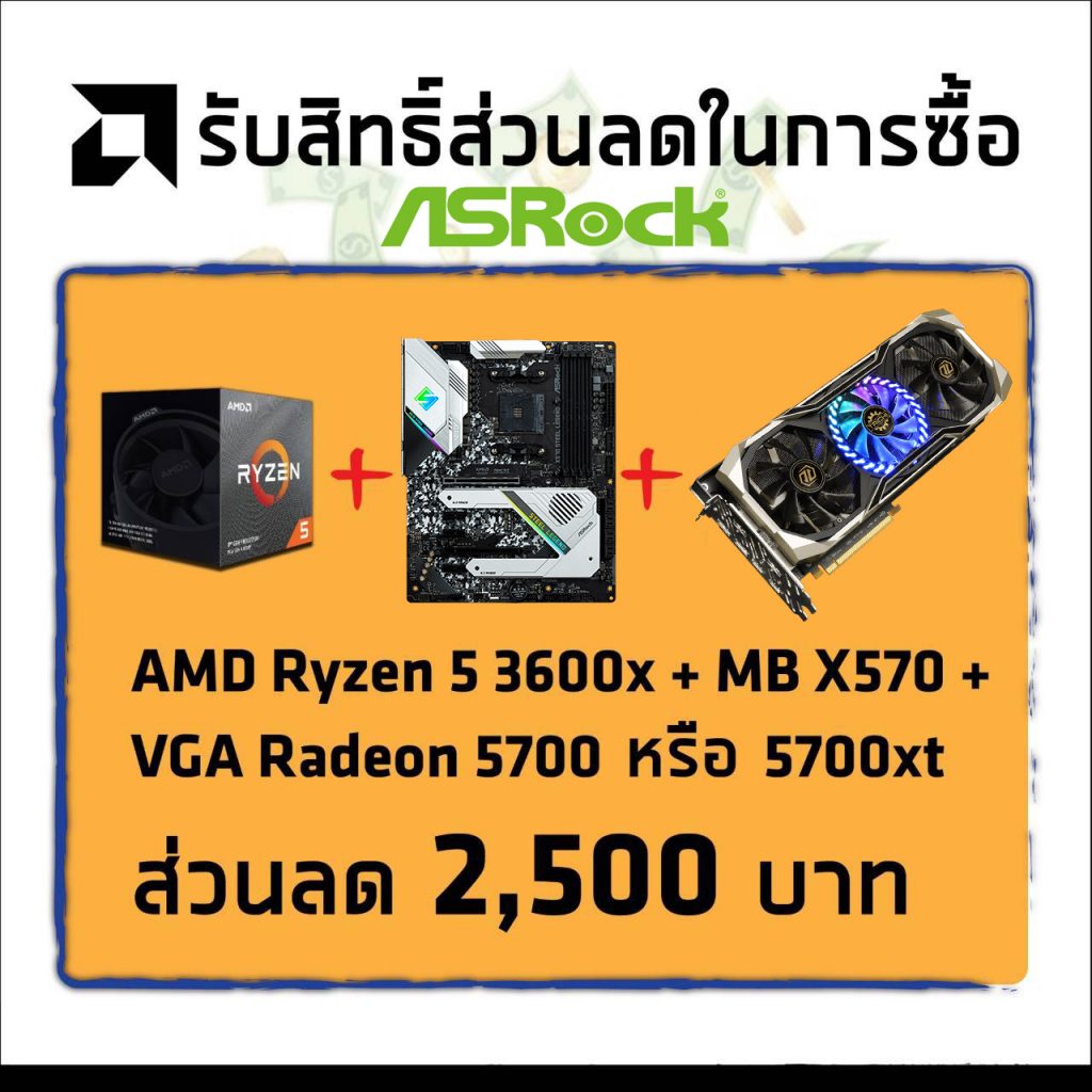 - Set 2 : AMD Ryzen 5 3600X + เมนบอร์ด X570 + การ์ดจอ Radeon RX 5700 หรือ RX 5700 XT (ส่วนลด 2,500 บาท)