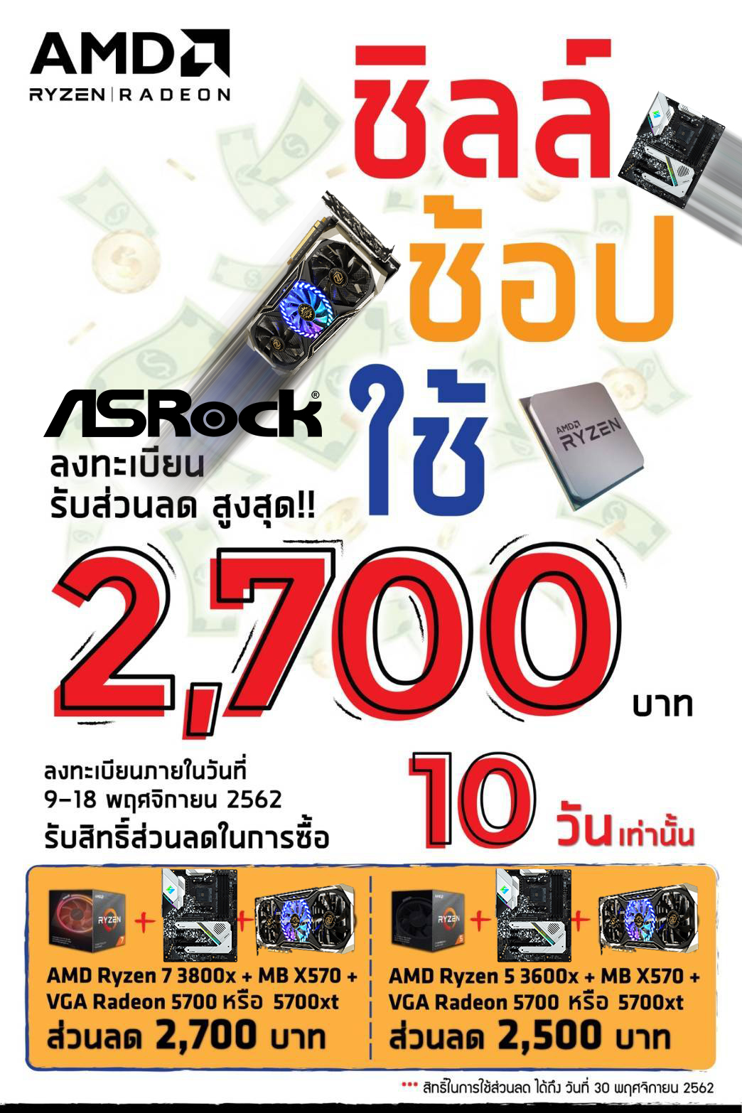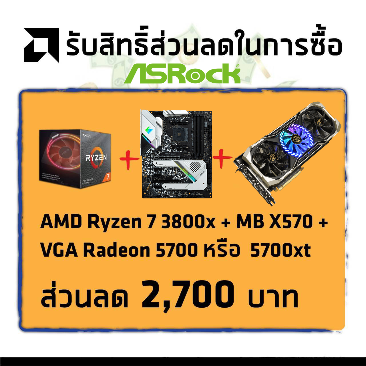 - Set 1: AMD Ryzen 7 3800X + เมนบอร์ด X570 + การ์ดจอ Radeon RX 5700 หรือ RX 5700 XT (ส่วนลด 2,700 บาท)