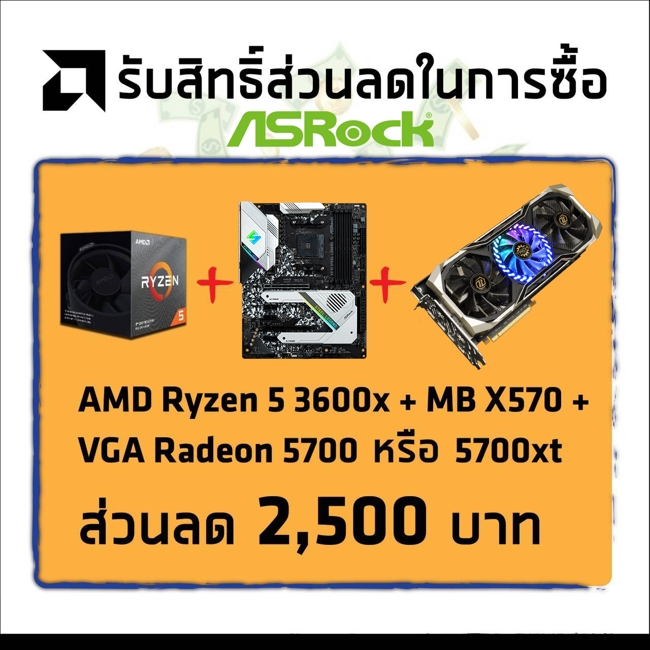 - Set 2 : AMD Ryzen 5 3600X + เมนบอร์ด X570 + การ์ดจอ Radeon RX 5700 หรือ RX 5700 XT (ส่วนลด 2,500 บาท)