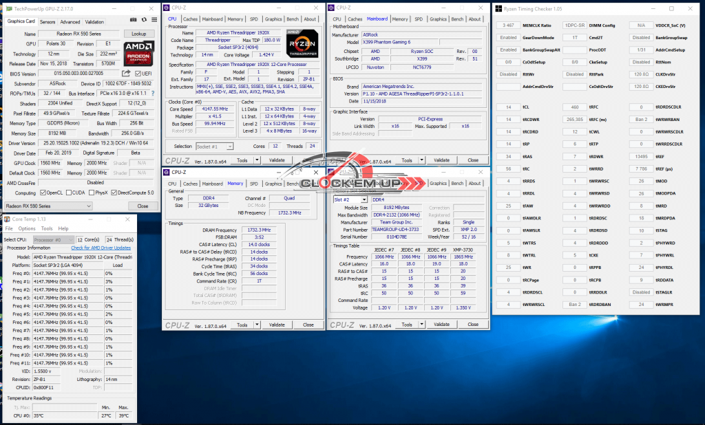 สำหรับรายละเอียดของการทดสอบในครั้งนี้ก็จะมีการ Overclock CPU AMD Ryzen TR1920X 12C/24T ร่วมกับเมนบอร์ด ASRock X399 Phantom Gaming 6 โดยสามารถ Overclock CPU รุ่นนี้ไปได้ที่ความเร็ว 4.15Ghz ด้วยไฟเลี้ยง 1.425V BIOS Set โดยชุดระบายความร้อนนั้นเลือกใช้ของ be quiet! DARK ROCK PRO TR4 สำหรับ Threadripper โดยเฉพาะ พบว่าสามารถระบายความร้อน CPU TR4 ได้อย่างมีประสิทธิภาพได้สุดจริงๆ ครับ โดยถ้าห้องยิ่งเย็นก็ยิ่งวิ่งดี….