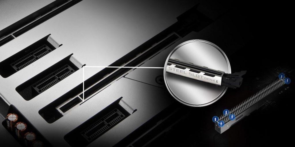 Steel slot รุ่นใหม่ มาพร้อมการรองรับ PCI-Express 4.0 เต็มรูปแบบ ASRock เพิ่มความแข็งแรงให้กับสล็อต PCI-Express ด้วย Steel Slot ในการเพิ่มจุดยึดและครอบโลหะ ให้รองรับกราฟิกการ์ดที่มีขนาดใหญ่ นอกจากนี้ยังสนับสนุน PCI-Express 4.0 รุ่นใหม่ ที่ให้ความเร็วสูงกว่า 3.0 เท่าตัวอีกด้วย