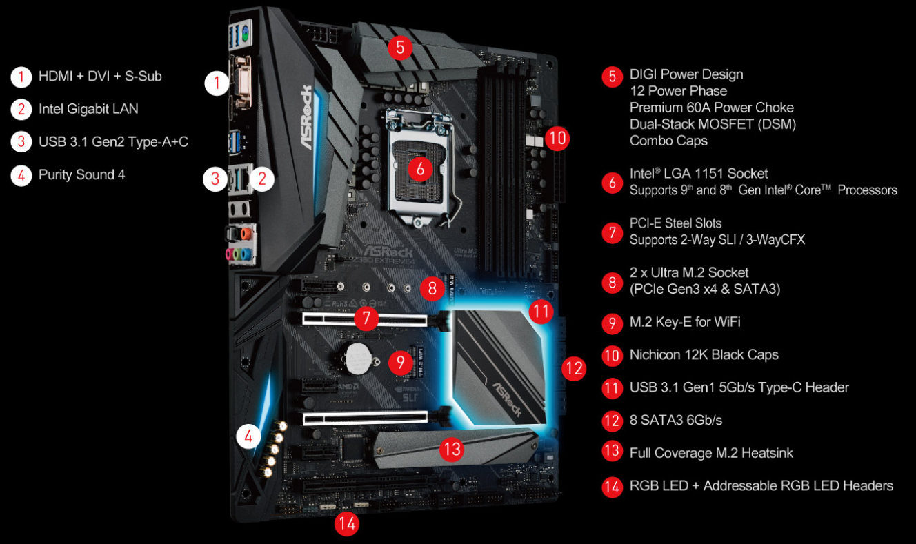 มาดู Feature ต่างๆ ที่น่าสนใจกันสักเล็กน้อยกับเจ้า ASRock Z390 EXTREME 4 ตัวนี้กันครับ จากที่ผมดูแบบคร่าวๆ แล้วนะ… มันค่อนข้างครบถ้วนเลยนะเออ… ไม่ว่าจะเป็นภาคจ่ายไฟของ CPU ที่ทำออกแบบเผื่อ Gen9 อย่าง i9-9900K 8C/16T โดยใช้ภาคจ่ายไฟขนาด 12-Phase ด้วย Modfet แบบ Dual Stack ตัวละ 60A เอาอยู่สบายแน่นอน และยังมาพร้อมกับ Heatsink ระบายความร้อรที่ค่อนข้างใหญ่อรกด้วย จึงไม่ต้องกังวลเรื่องความร้อนของภาคจ่ายไฟ ส่วน M.2 นั้นเป็นแบบ Ultra M.2 Socket PCIe3.0 x4 ให้มาทั้งหมด 2 ช่อง และให้ Heatsink M.2 มาอีก 1 ชุด และเรื่องของแสงสี RGB นั้นก็ค่อนข้างจัดเต็มด้วยช่องเสียบแบบ ARGB 5V 3-Pin จำนวน 1 ช่อง และแบบ RGB +12V 4-Pin จำนวน 2 ช่องครับ