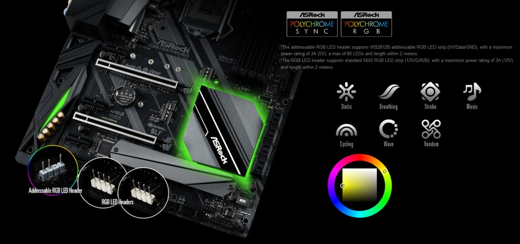 ยุคนี้อะไรๆ ก็ RGB ดังนั้นเมนบอร์ดรุ่นนี้จึงจัดเรื่องของการรองรับจุดต่อสาย RGB Strip มาให้ทั้งหมด 3 ช่อง โดยประกอบไปด้วยช่องเสียบแบบ Addressable RGB LED 5V 3-Pin จำนวน 1 ช่อง และแบบ RGB LED Header 12V 4-Pin ให้อีก 2 ช่อง โดยจะควบคุมเรื่องการแสดงผลผ่านทาง ASRock Polychrome RGB Sync