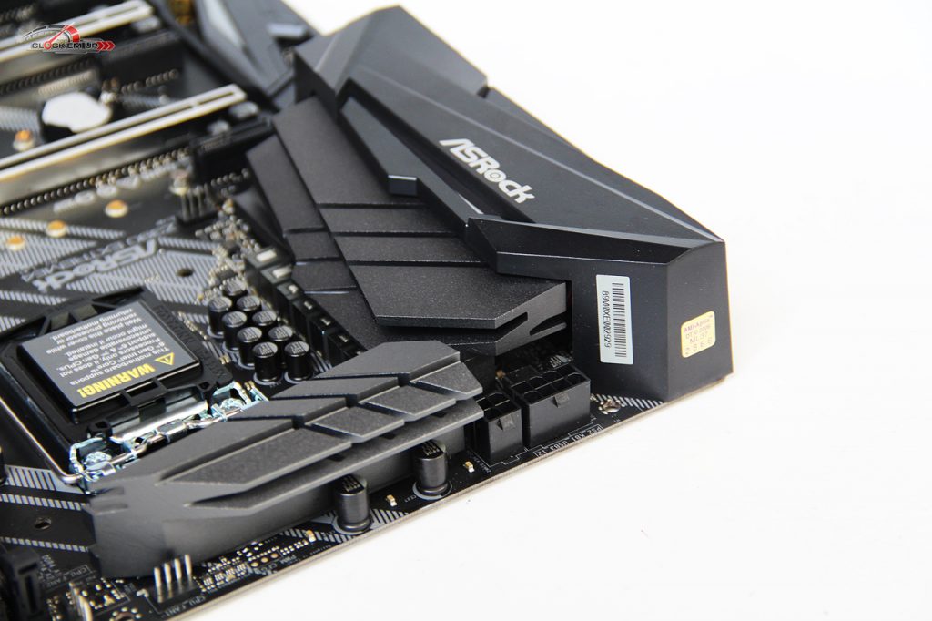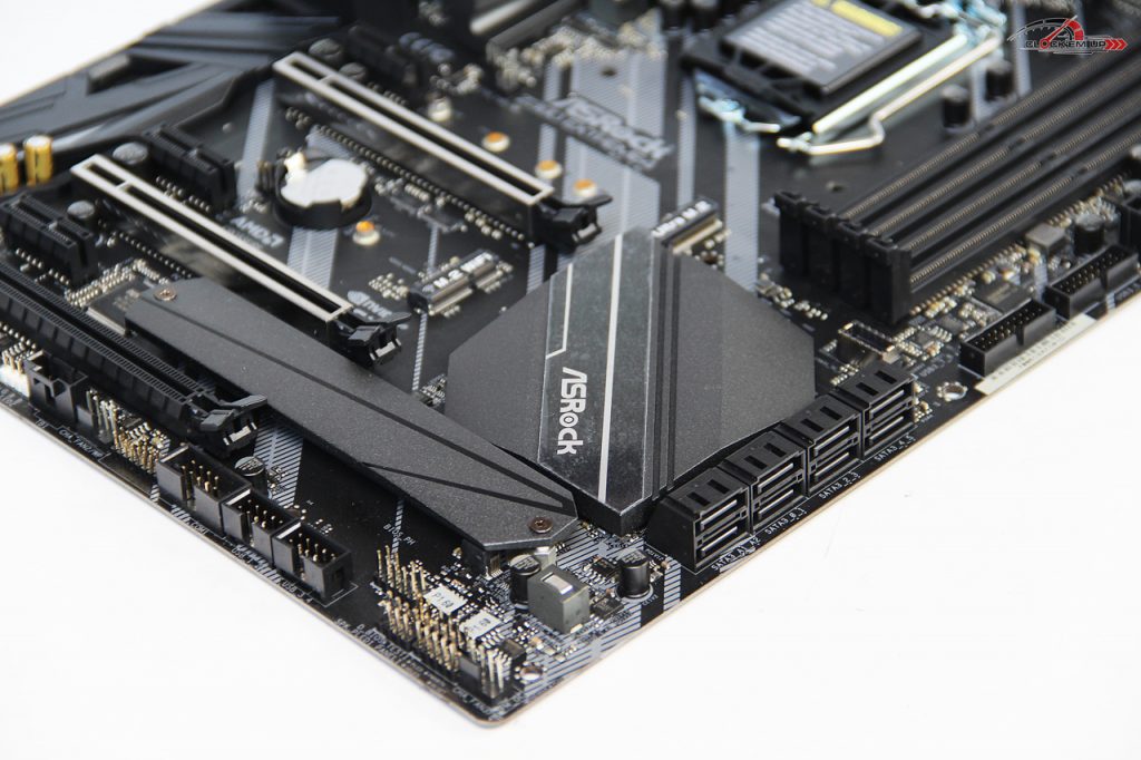 บริเวณชิปเซ็ต Intel Z390 Express นั้นก็มี Heatsink ระบายความร้อนขนาดใหญ่อย่างดีมาให้เรียบร้อย ส่วนช่องเสียบ SATA3.0 6Gb/s นั้นมีทั้งหมด 8 ช่อง โดบควบคุมผ่านชิปเซ็ต Intel Z390 PCH ทั้งหมด 6 ช่อง รองรับการต่อทำงานแบบ RAID 0, 1, 5 และ 10 ส่วนอีก 2 ช่องจะมาจากชิปเสริม ASMesia ASM1061 ไม่รองรับการต่อช้งานแบบ RAID นะครับ