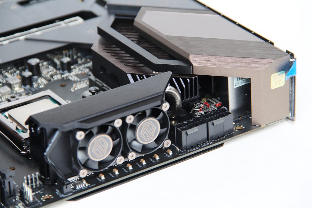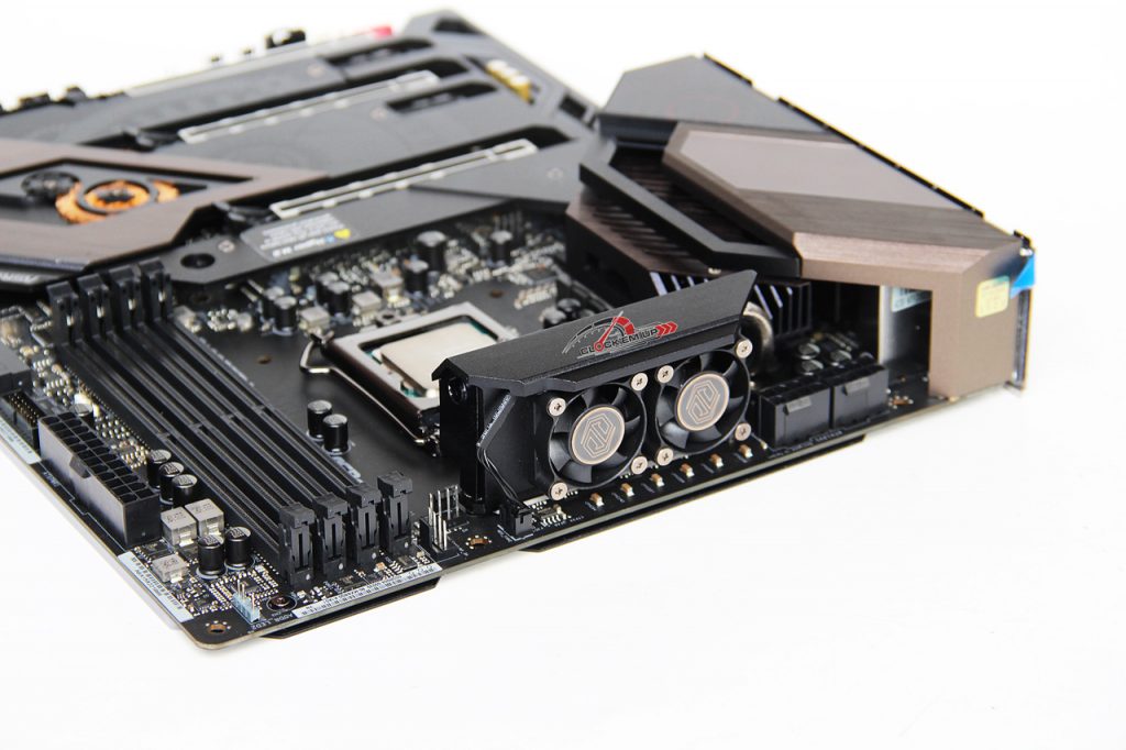 Heatsink ระบายความร้อนภาคจ่ายไฟมีการติดตั้งพัดลมขนาดเล็กด้านบนให้อีก 2 ตัว และที่บริเวณ Heatsink ด้านในอีก 1 ตัวครับ