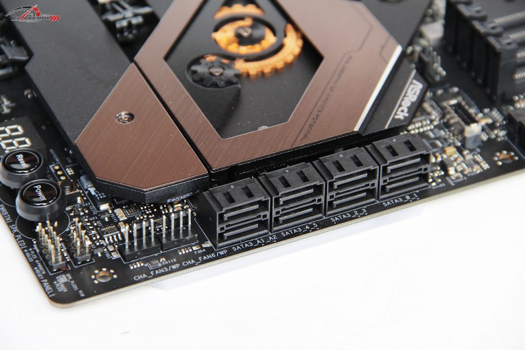 ช่องเสียบ SATA3.0 6Gb/s มีทั้งหมด 8 ช่อง โดย 6 ช่องแรกจะคุมตรงจากชิป Intel Z490 Express สามารถต่อใช้งานแบบ RAID 0, 1, 5 และ 10 ได้ ส่วนอีก 2 ช่อง A1 และ A2 จะเป็นชิปเสริมจาก ASMedia ASM1061