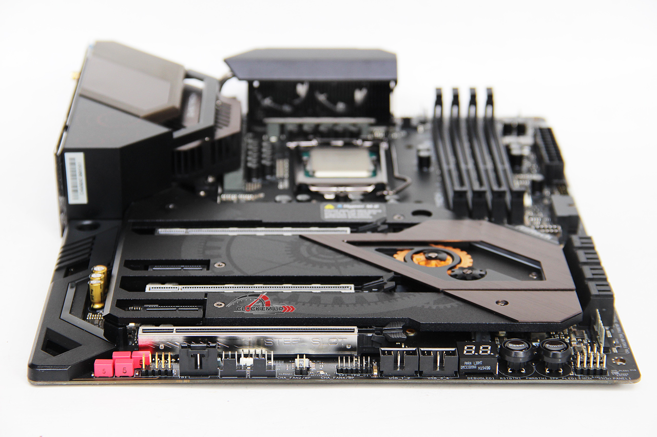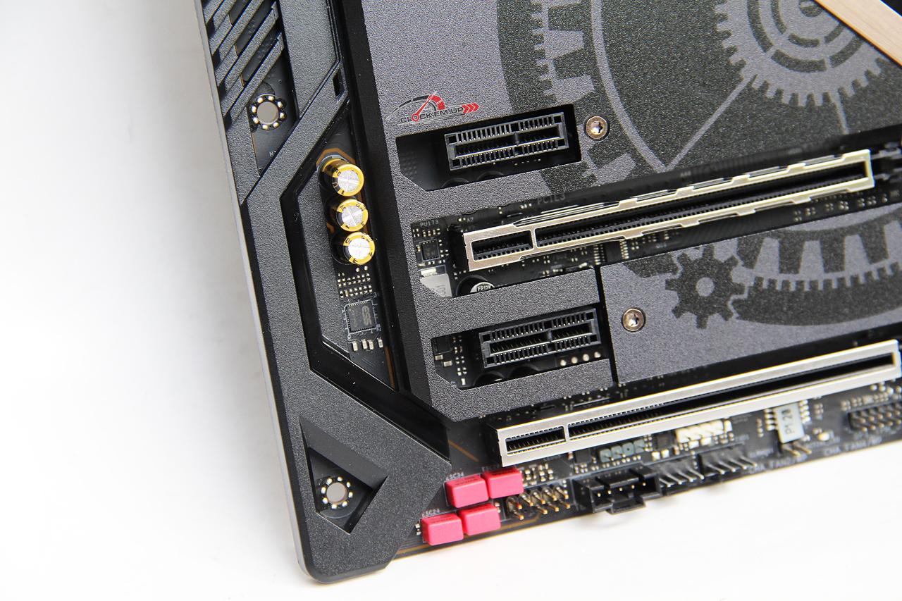 ช่องเสียบ PCIe3.0 x16 มีทั้งหมด 3 ช่อง รองรับการต่อใช้งานแบบ Multi-GPU SLI แบบ 2-Way (x8+X8) และ AMD CrossfireX แบบ 3-Way (x8+x8+x4) ส่วนช่องเสียบ PCIe3.0 x1 มีมาให้อีก 2 ช่อง