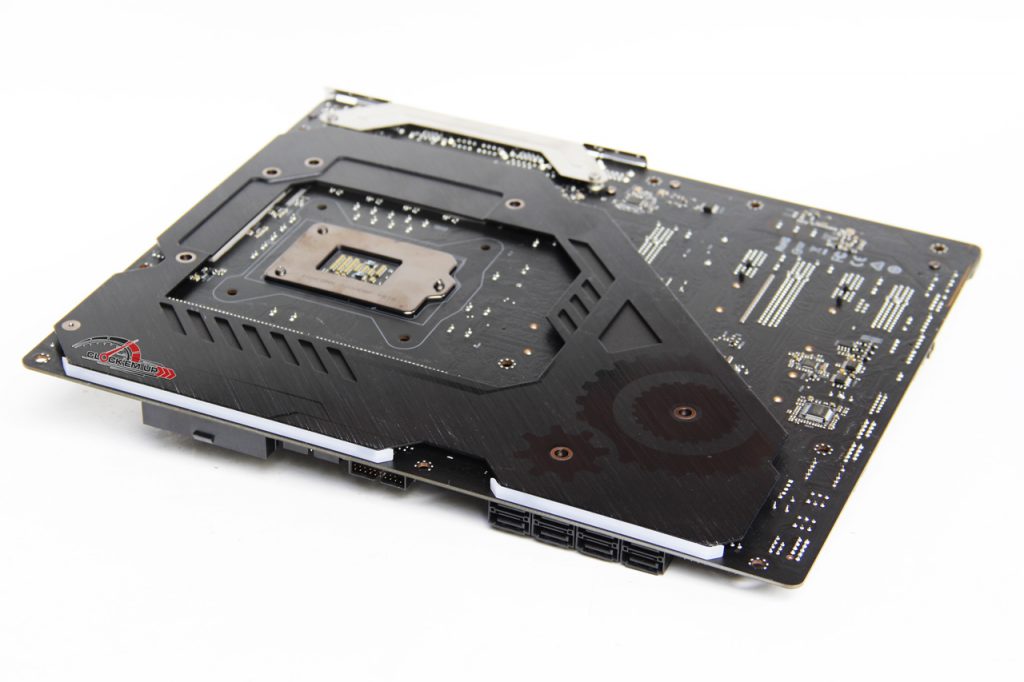 บริเวณด้านหลังของเมนบอร์ดนั้นมีการติดตั้ง Back Plate อลูมิเนียมขนาดใหญ่ไว้เสริมความแข็งแรงและดูดวับความร้อนด้านหลังภาคจ่ายไฟของ CPU ได้อีกด้วยครับ สุดยอดไปเลย ^^”