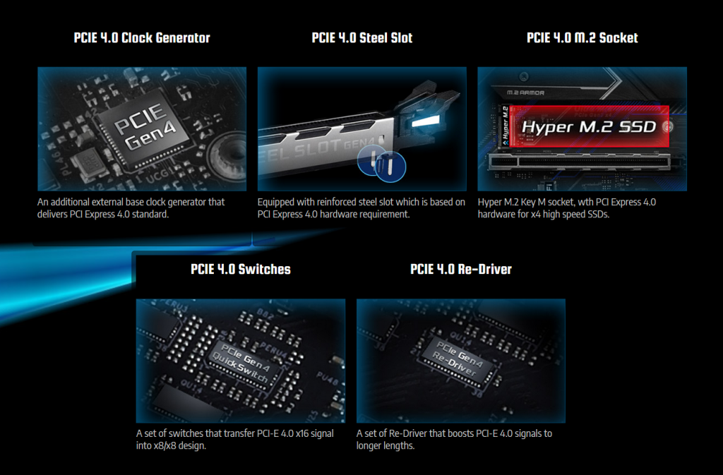 ASRock ได้ติดตั้งชิป PCIe 4.0 Clock Gen ไว้ในเมนบอร์ดนะครับ ดังนั้น Device ที่เป็น PCIe4.0 สามารถนำมาทำงานได้บนเมนบอร์ดรุ่นนี้อย่างเช่น M.2 PCIe4.0 x4 หรือการต่อใช้งานช่อง PCIe4.0 ในช่อง x16 ก็สามารถใช้งานได้แต่จะเปลี่ยนการทำงานจาก x16 มาเป็น PCIe 4.0 x8/x8 แทน…