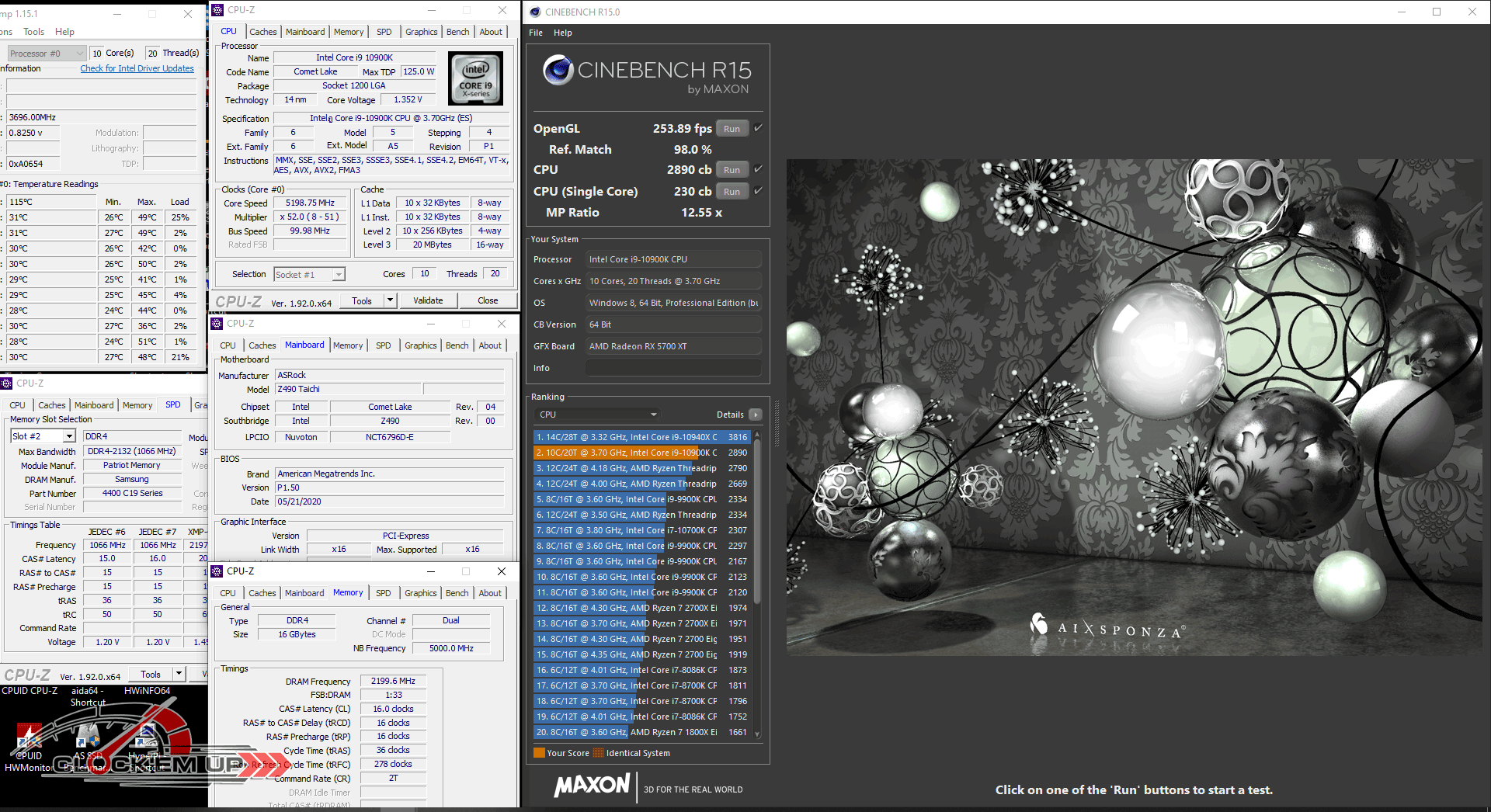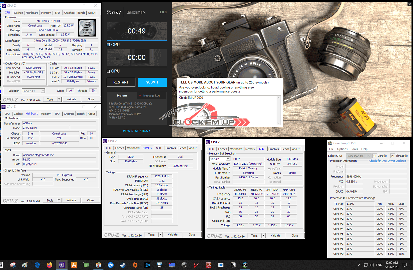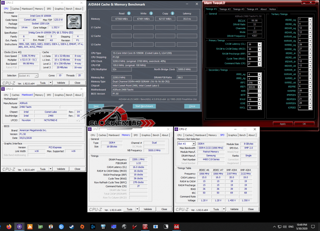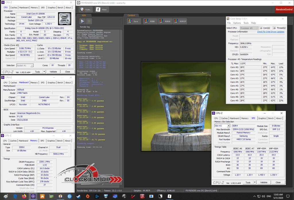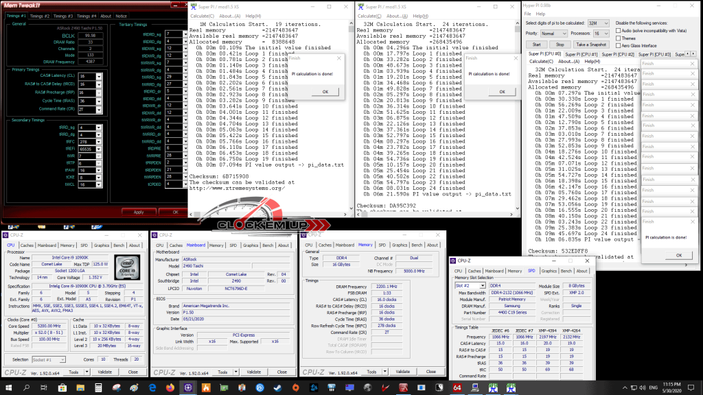 และด้านล่างนี้ก็จะเป็นผลการ Overclock และความแรงของ CPU Intel Core i9-10900K @5.2Ghz/5.0Ghz + DDR4-4400Mhz CL16-16-16-36 1.63V 2T + Very Tight Sub-Timing ที่สามารถทดสอบ Benchmark ต่างๆ ผ่านได้อย่างมีเสถียรภาพดีระดับหนึ่ง ซึ่งต้องบอกเลยว่า แรงแบบไม่ธรรมดาจริงๆ สำหรับ ASRock Z490 Taichi + แรม Samsung B-Die ดีๆ สักคู่หนึ่ง ^^”