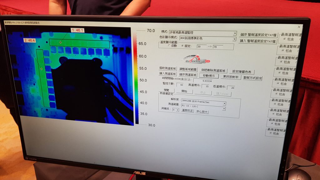 ส่วนจุดนี้ก็จะเป็นการโชว์ประสิทธิภาพของการออกแบบภาคจ่ายไฟในรูปแบบ Teamed Phase ที่เปิดโชว์และวัดอุณหภูมิของภาคจ่ายไฟให้เห็นกันแบบจะๆ ว่าช่วงที่ทดสอบ AVX ของ CPU แบบโหดๆ อยู่นั้น ภาคจ่ายไฟที่ไม่มี Heatsink ระบายความร้อนก็ยังเผยให้เห็นอุณหภูมิการทำงานของ Mosfet อยู่ที่ประมาณ 46c องศาเท่านั้นเอง สุดยอดไปเลยครับ หุหุ…. ( CPU ที่เอามาโชว์น่าจะเป็น RYZEN 7 2700X)