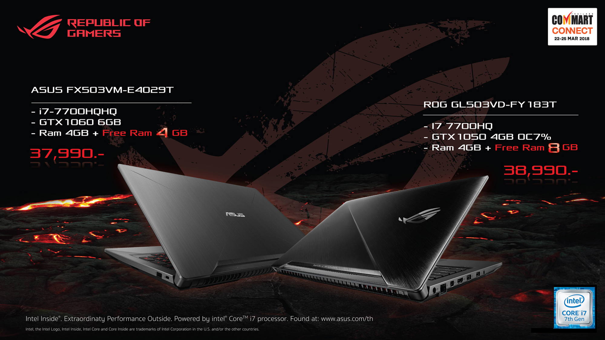 พบกับโน้ตบุ๊ค “ASUS” และเกมมิ่ง โน้ตบุ๊ค “ROG” ที่ตัวแทนจำหน่ายอย่างเป็นทางการที่บูธ Advice, IT City, JIB, Speed และ Top Marketing ในงาน “COMMART CONNECT 2018” ระหว่างวันที่ 22–25 มีนาคม 2561 ณ ศูนย์การประชุมแห่งชาติสิริกิติ์ หรือสอบถามรายละเอียดเพิ่มเติมได้ที่ www.asus.co.th www.facebook.com/ASUSTHAILAND และเอซุส คอลเซ็นเตอร์ 02-401-1717