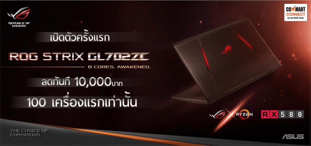 เปิดตัวการขายครั้งแรกในประเทศไทย กับเกมมิ่งโน้ตบุ๊ค ที่ใช้ CPU AMD Ryzen7 ระดับ 8 คอร์ กับรุ่น ROG Strix GL702ZC-GC256T พร้อมรับส่วนลดทันทีมูลค่า 10,000 บาท จำนวนจำกัดเพียง 100 เครื่องเท่านั้น และทุกรุ่นพร้อมผ่อน 0% นาน 10 เดือน กับบัตรเครดิตที่ร่วมรายการ