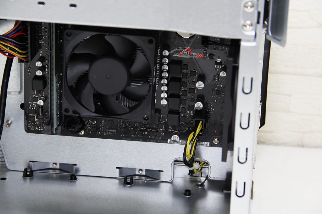 แกะดูด้านในกันเลยดีกว่าครับกับ ROG STRIX GL10DH TH007T ตัวนี้ โดยเมนบอร์ดด้านในนั้นจะเป็นรุ่นพิเศษที่ทำออกมาสำหรับ Gaming Desktop รุ่นนี้โดยเฉพาะ  ซึ่งจะใช้ชื่อรุ่นว่า GL10DH เป็นเมนบอร์ดที่ใช้ Socket AM4 + ชิปเซ็ต AMD B450 Chipset  โดยจะมีช่องเสียบ SATA3.0 6Gb/s ทั้งหมด 4 ช่อง, M.2 PCIe3.0 x4 จำนวน 1 ช่อง,