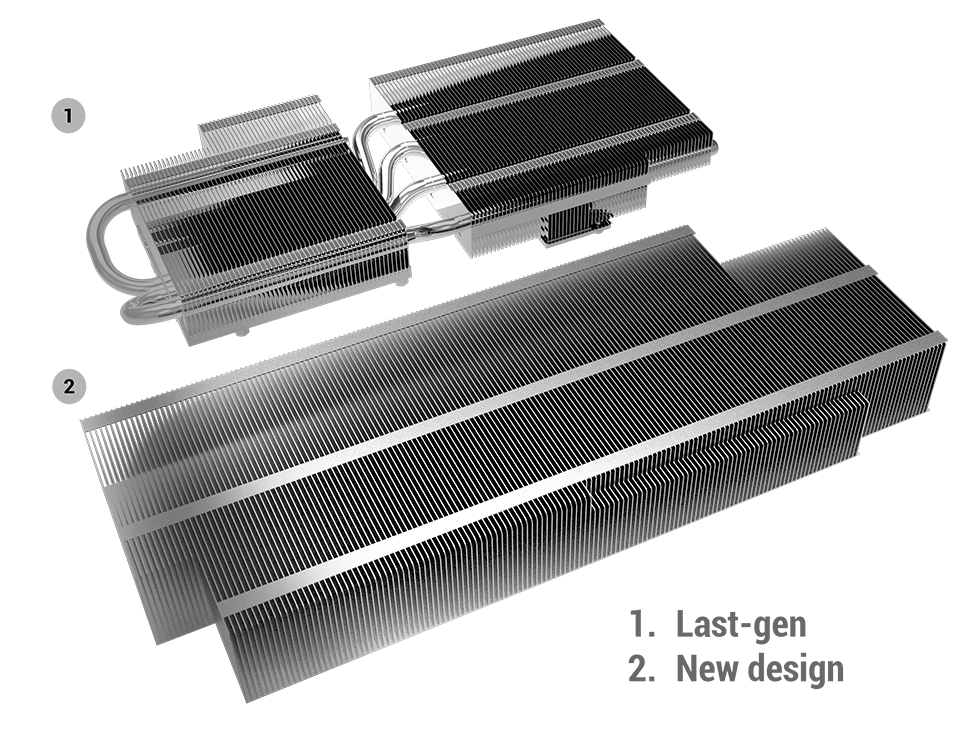 - Extreme Cooling with 2.7 slot width to provide 2x the surface area than the previous generation heatsink, allowing for more efficient thermal transfer.