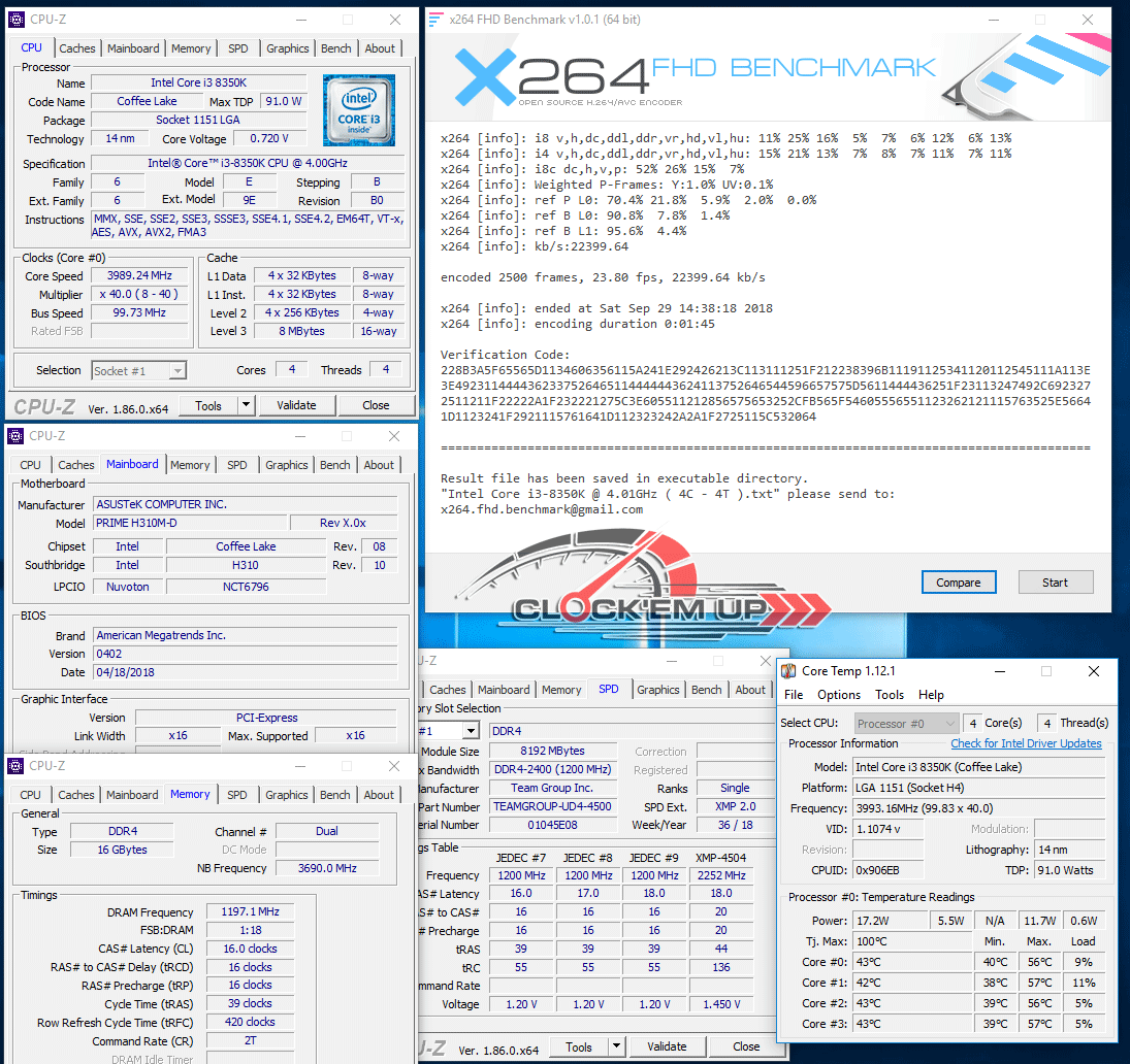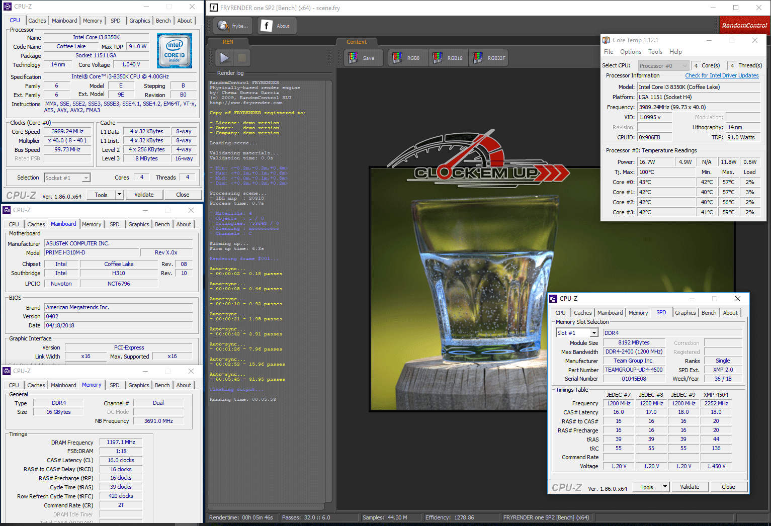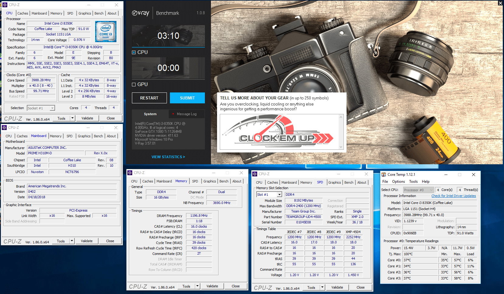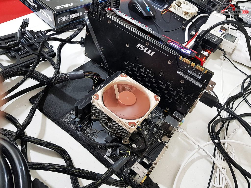 ภาพบรรยากาศในการทดสอบครั้งนี้ครับ โดยเราจะต่อใช้งานร่วมกับ CPU Intel Core i3-8350K 4C/4T โดยใช้ชุดระบายความร้อนของ Noctua NH-L9x65 ส่วนเมนโมรี DDR4 นั้นหยิบเอาของ T-Force XTREEM 4500CL18 คู่ละ 16GB มาเสียบใช้งาน ดังนั้นด้วยคุณสมบัติที่จำกัดของชิปเซ็ต Intel H310 จึงทำให้มันทำงานได้ตามความเร็วแรม Native ของ CPU ได้เท่านั้น กล่าวคือ DDR4-2400Mhz