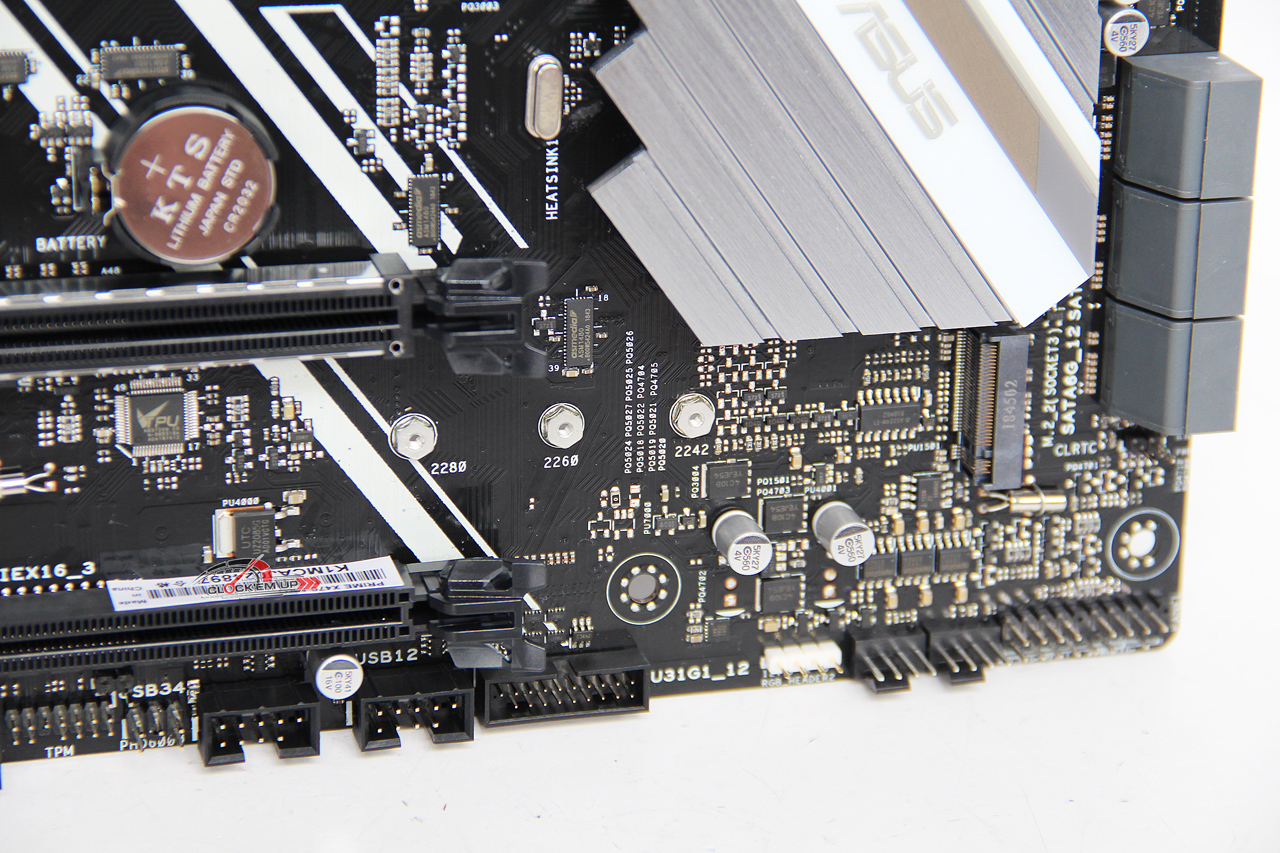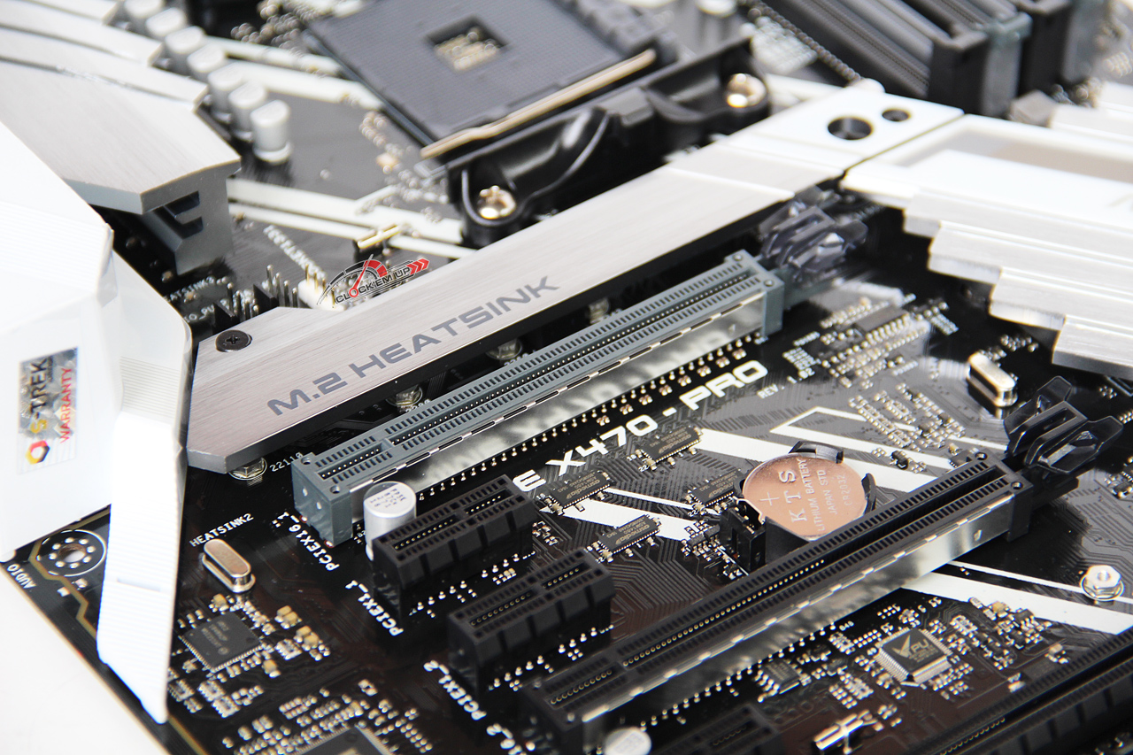 บริเวณ M.2 Heatsink และการติดตั้ง SafeSlot ให้กับช่องเสียบ PCIe3.0 x16 ใน 2 ช่องแรกเพื่อความแรงของของ Slot เวลาติดตั้งกราฟิกการืดขนาดใหญ่ที่มีน้ำหนักเยอะ