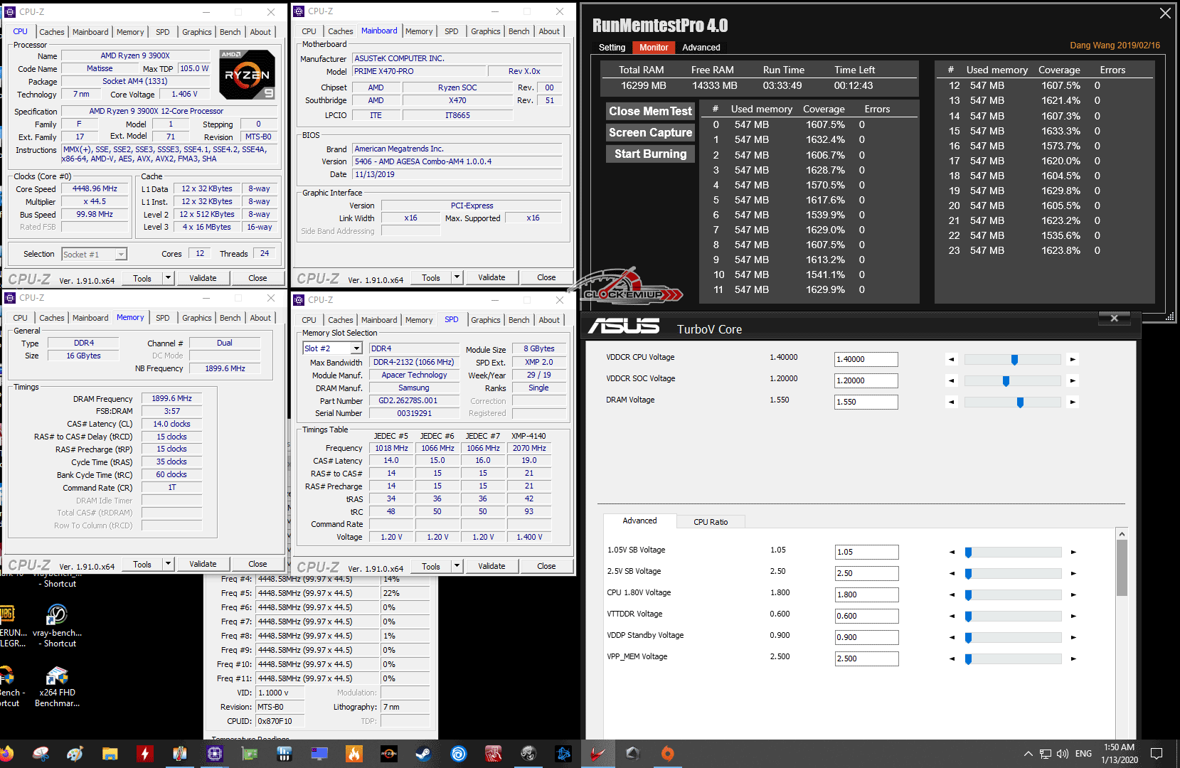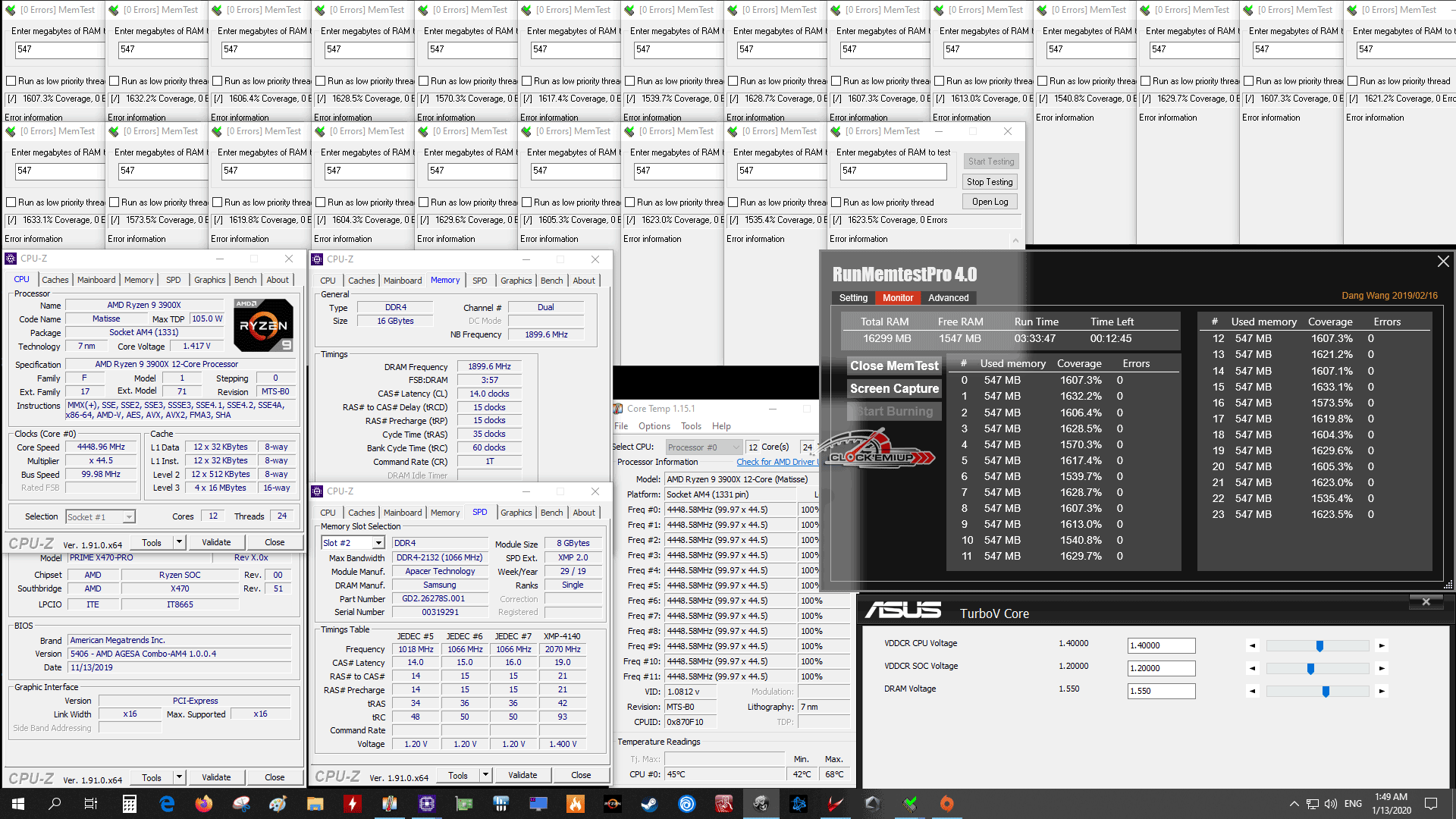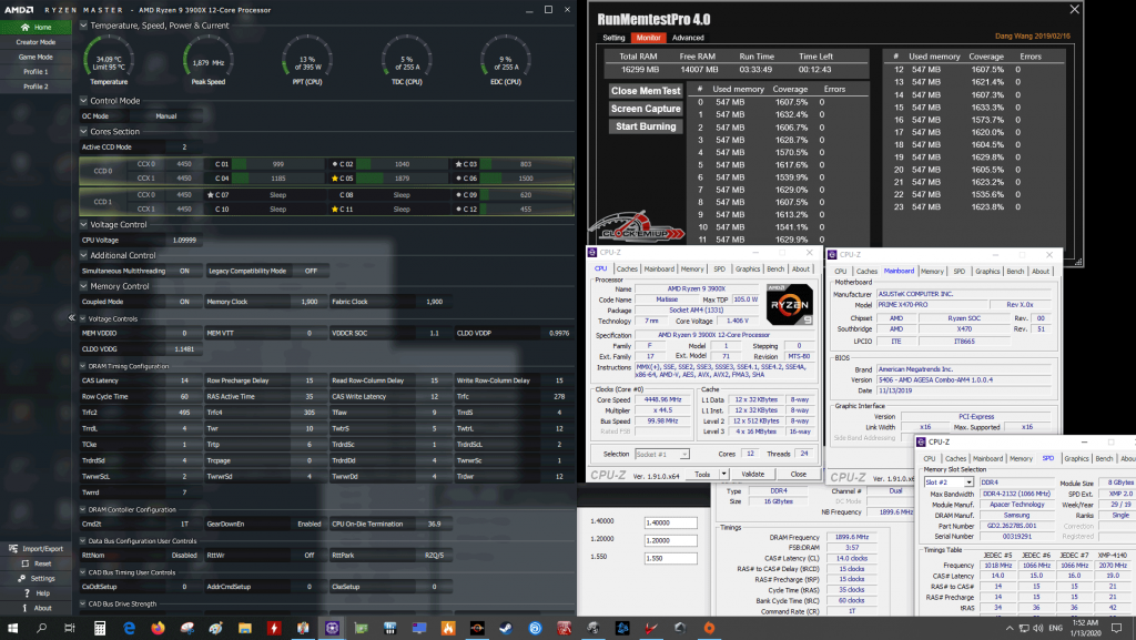 ผลการทดสอบในครั้งนี้เราจะทดสอบ Overclock ร่วมกับ CPU AMD Ryzen 9 3900X 12C/24T ไปที่ความเร็ว 4.45Ghz Fix All Cores 1.40V + LLC Level 4 BIOS Set และส่วนแรม DDR4 นั้นเราจะทำการ Overclock ในแบบ Fclk/Mclk 1:1 ที่ความเร็วแรม DDR4-3800Mhz CL14-15-15-35 1T 1.55V (Uclk 1900Mhz) + การปรับแต่ง Sub-Timimg แบบแน่นๆ เรียกประสิทธิภาพสูงสุดของแรมมาให้ได้มากที่สุด และต้องแปลกในอย่างมากที่เมนบอร์ดรุ่นนี้สามารถกด Sub-Timing แบบแน่นๆ ได้ง่ายมาก กดเป็นมาๆ ไถือว่าไม่ธรรมดาเลยนะครับ เพราะ ROG รุ่นใหญ่ๆ บางรุ่นยังไม่บูทเลย แถมยังไม่เสถียรภาพเท่าบอร์ดรุ่นนี้อีกด้วย ลองคิดดูครับนี่ผลการทดสอบ Memtest ลากยาวๆ 1600%+ ใช้เวลาทดสอบกว่า 3 ชั่วโมงครึ่ง ต่อเนื่องในห้องไม่เปิดแอร์นะครับ 28-30c ตลอดการทดสอบ ยังสามารถรันผ่านได้สบายๆ ม้วนเดียวจบ