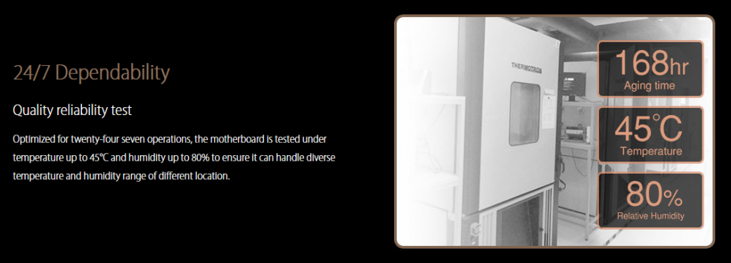 เมนบอร์ดทุกตัวผ่านการทดสอบแบบ 24/7 (168Hr) แบบต่อเนื่องในห้องอุณหภูมิ 45c และความชื้นสัมพัทธ์ 80% ให้ผ่านก่อนออกขายจริง ดังนั้นมั่นใจได้ในเรื่องความเสถียรภาพในการใช้งานแบบต่อเนื่องแบบทั้งวันทั้งคืนครับ