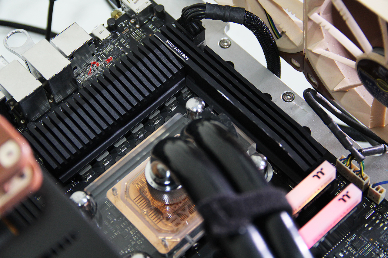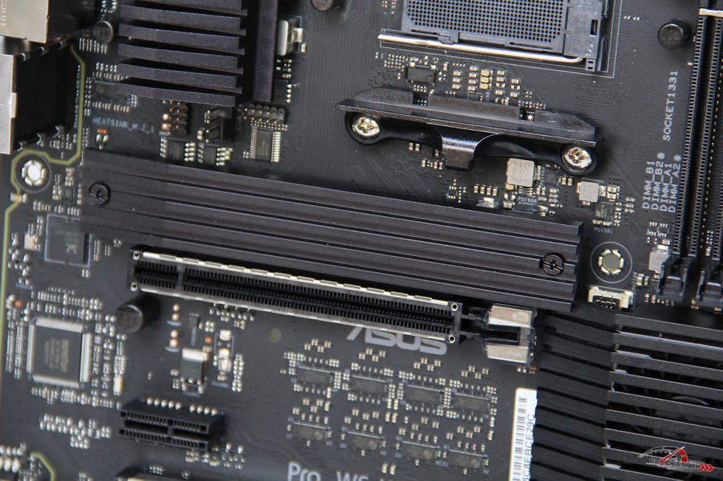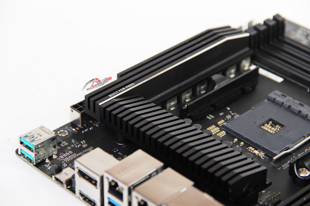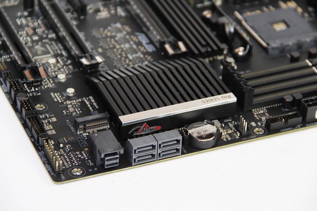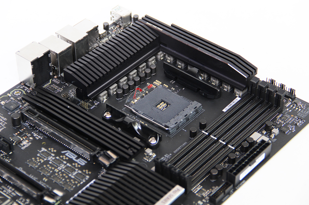 และยังมีการติดตั้งท่อ Heatpipe ช่วยในการดึงนำความร้อนให้อีกด้วยจัดว่าสุดจริงสำหรับเมนบอร์ด WorkStation ตัวนี้ ส่วนจุดเสียบไฟเลี้ยง CPU นั้นเป็นแบบ 12V 8-Pin จำนวน 1 ชุด มาพร้อมกรอบเหล็กหุ้มไว้เพื่อความแข็งแรงที่เรียกว่า ProCool II connector และยังได้ติดตั้งไฟ LED แสดงสถาณะการเสียบของขั่วเสียบให้อีกด้วยว่า ต่อใช้งานถูกต้องแล้วหรือไม่