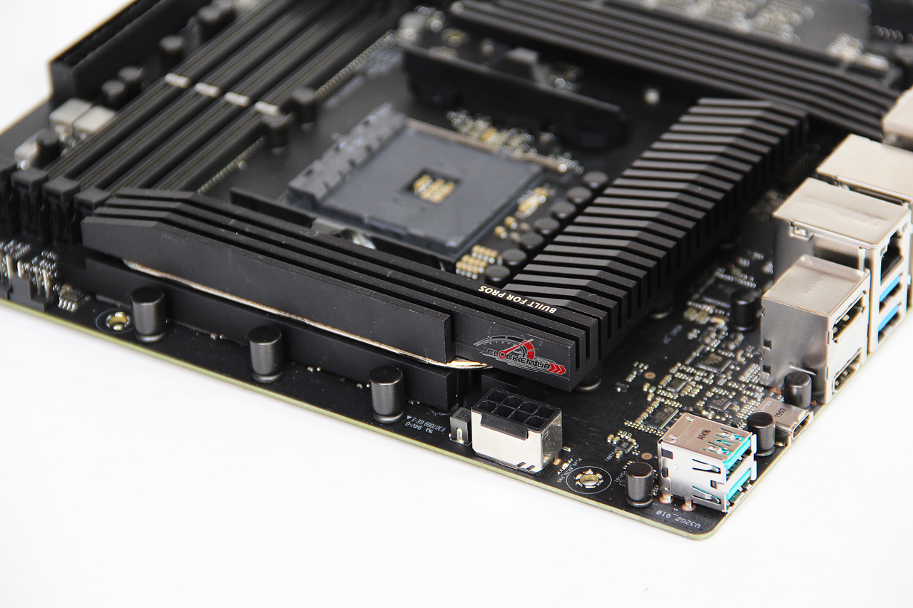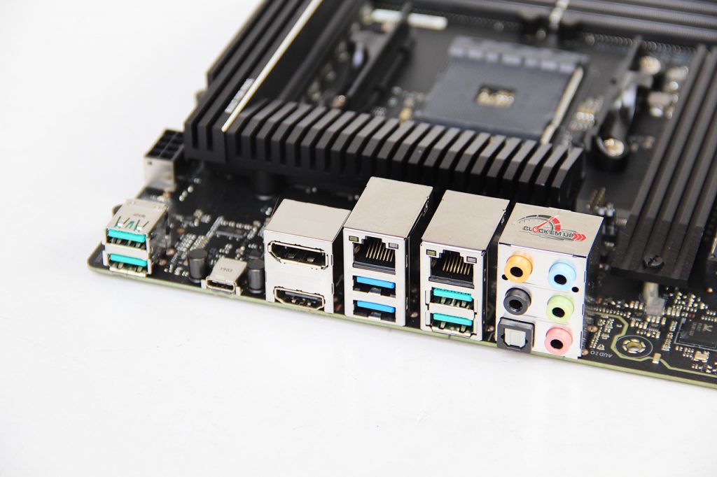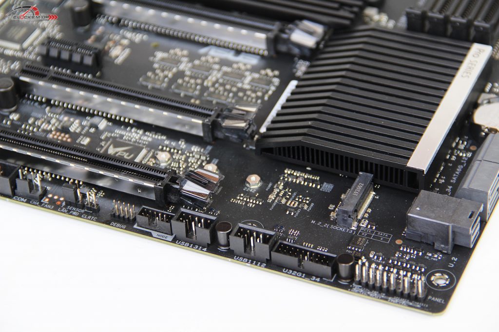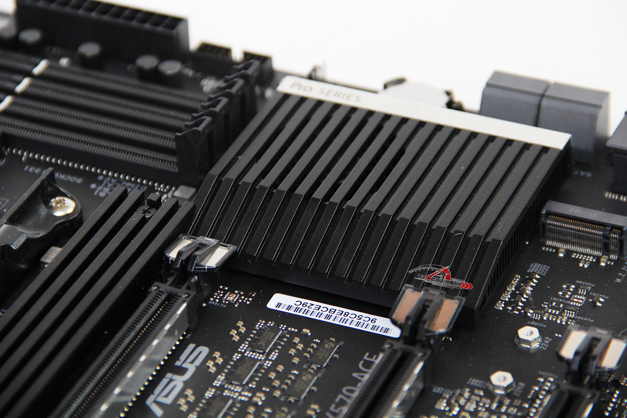 Heatsink ระบายความร้อนของชิปเซ็ต AMD X570 นั้นมีพัดลมระบายความร้อนอยู่ด้านในด้วยนะครับ และในส่วนของช่องเสียบ SATA3.0 6Gb/s นั้นมีทั้งหมดเพียง 4 ช่องเท่านั้น โดยทุกช่องรองรับการต่อใช้งานแบบ RAID 0, 1 และ 10 ส่วนช่อง U.2 PCIe3.0 x4 นั้นมีมาให้อีก 1 ช่อง