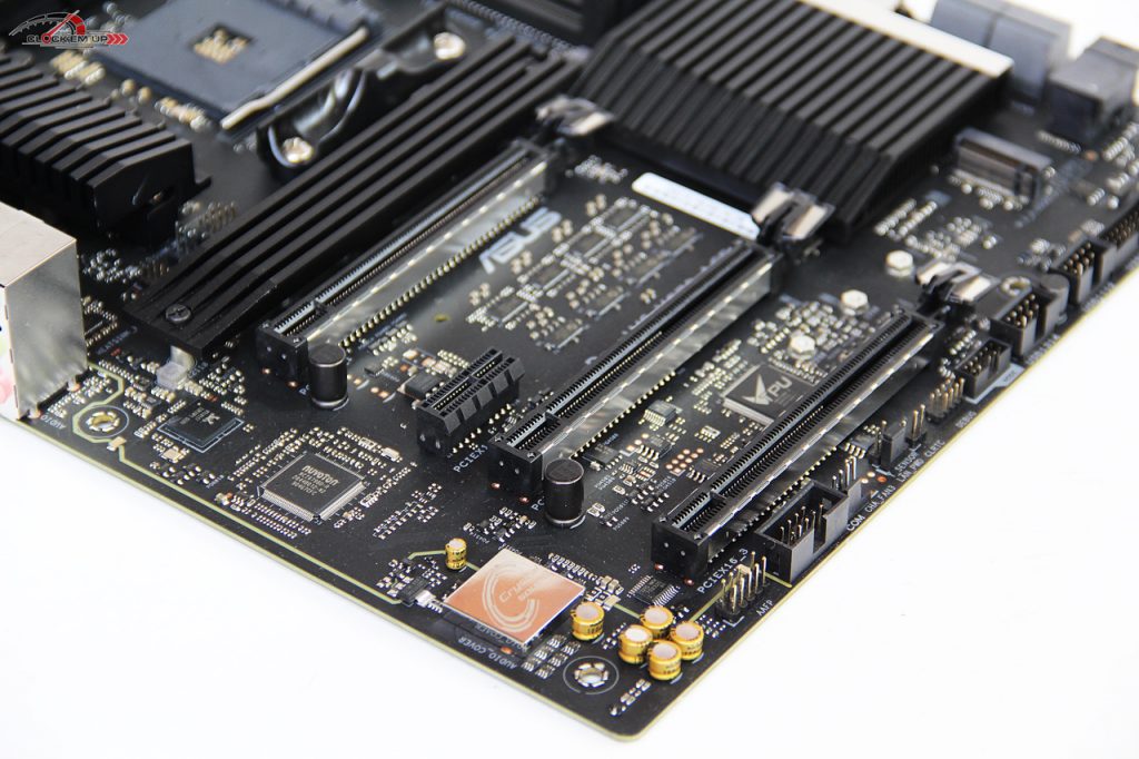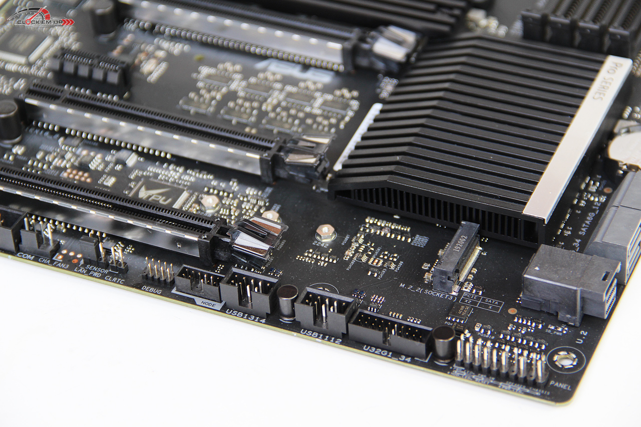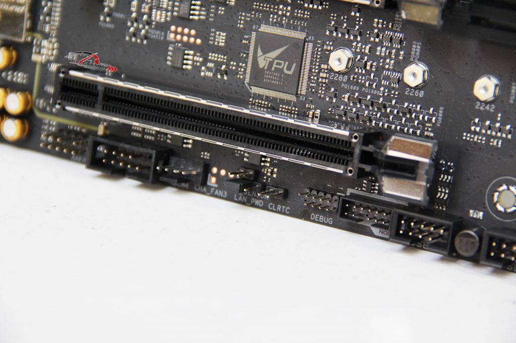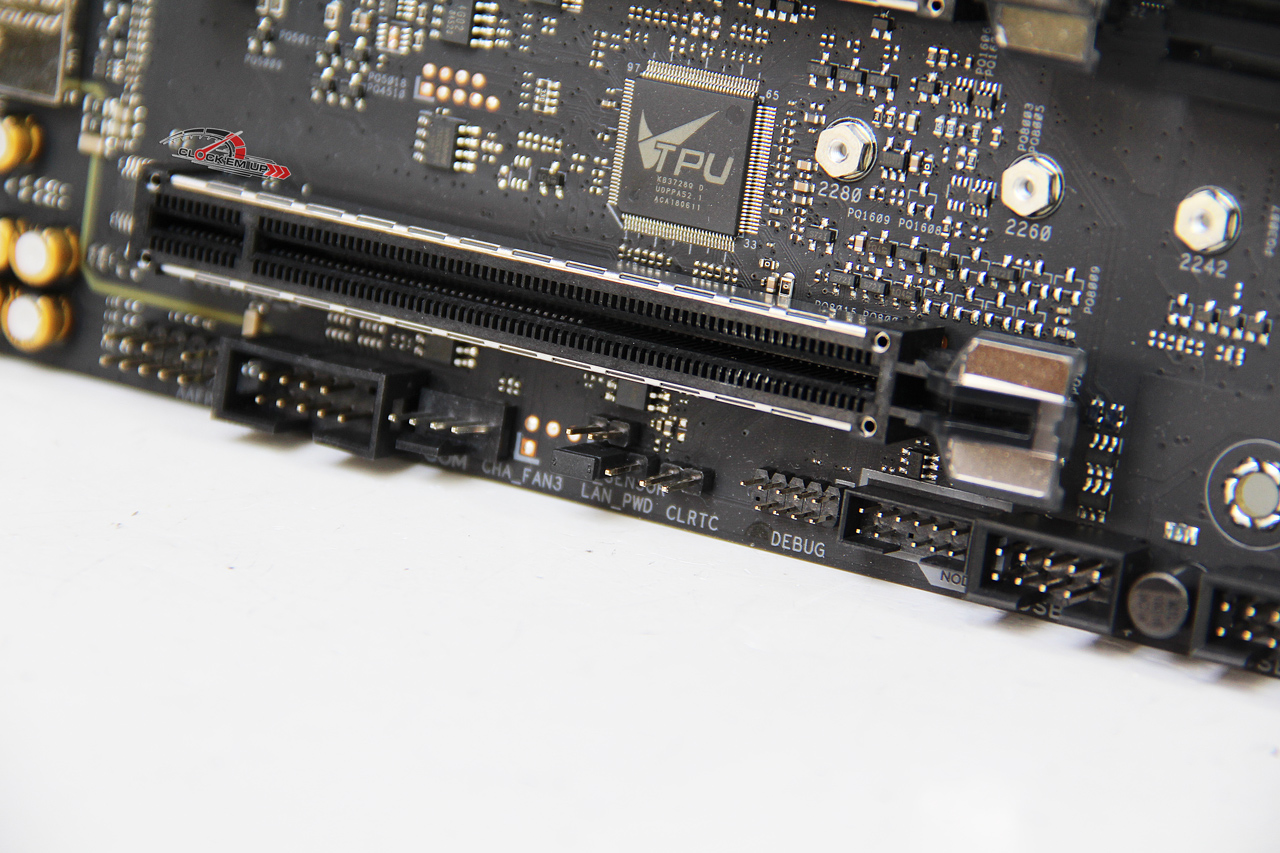 บริเวณจุด Clear CMOS และช่องเสียบ DEBUG ที่ต้องต่อแยกเอง และรวมถึงช่องเสียบ ASUS NODE ที่ทำเอาไว้เชื่อมต่อกับอุปกรณ์อื่นๆ ของทาง ASUS ที่ออกแบบไว้เพื่อ Monitor อัตราการใช้พลังงานของ PSU ที่รองรับและรวมถึงการต่อร่วมกับชุด ASUS Fan Extension Card II ได้อีกด้วย