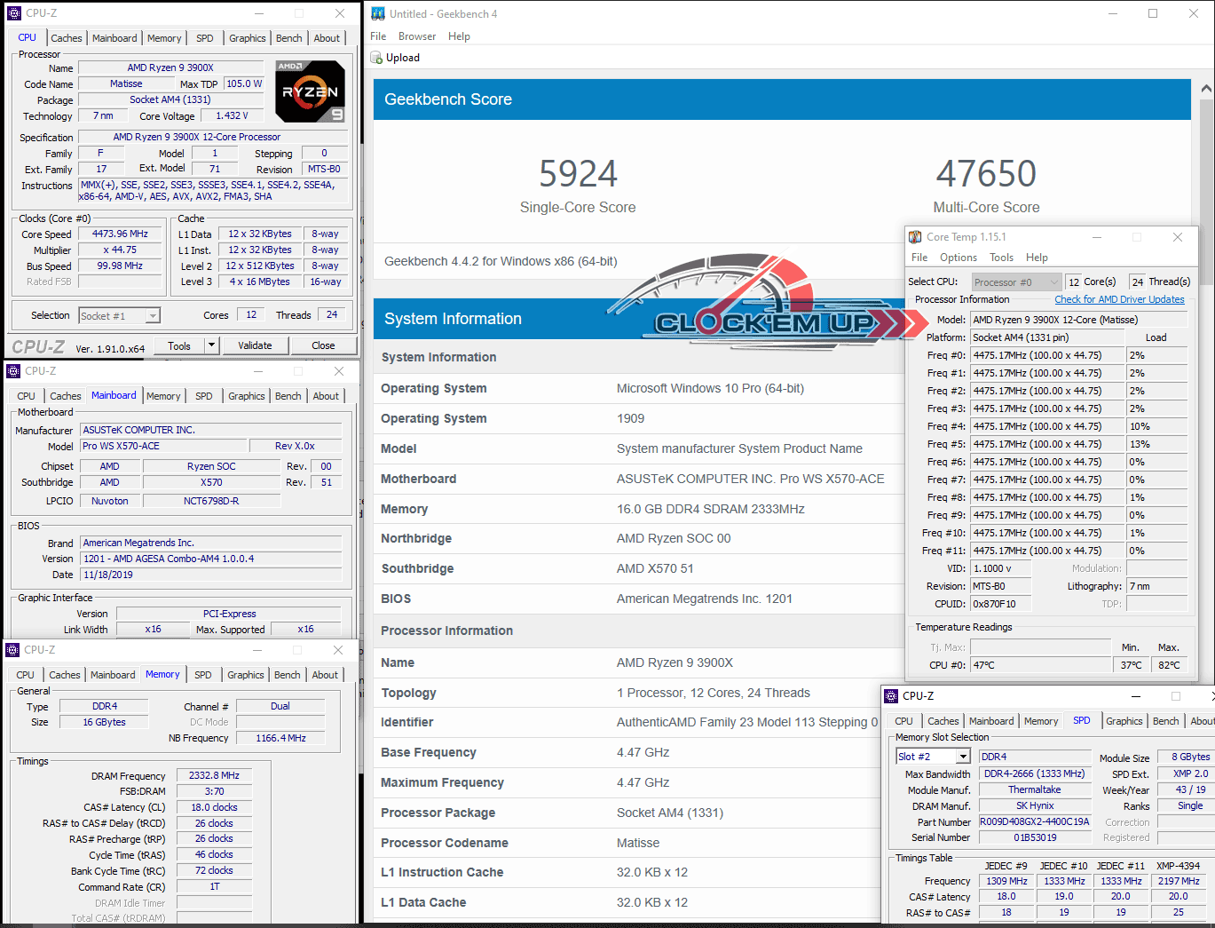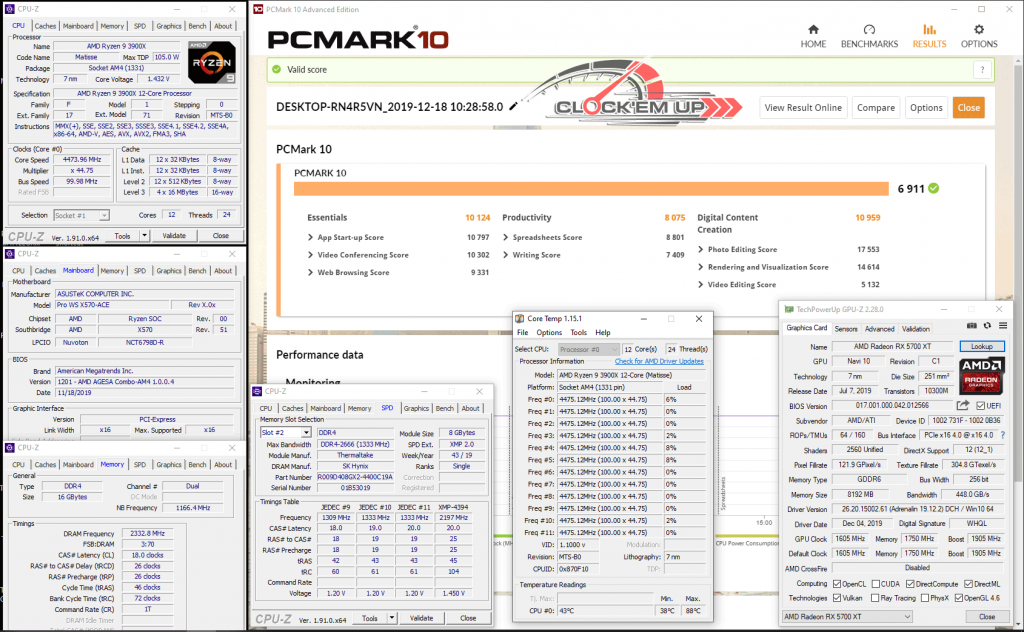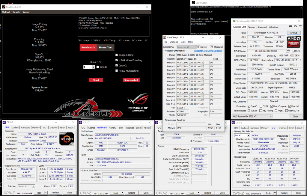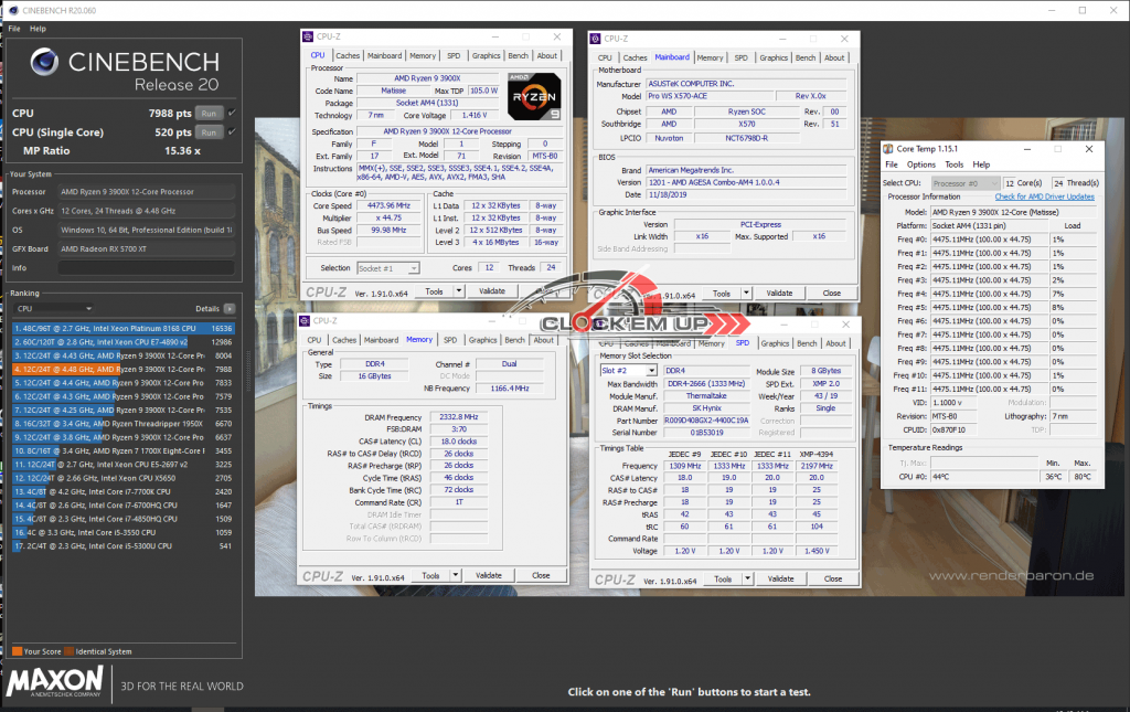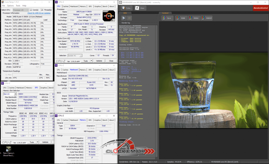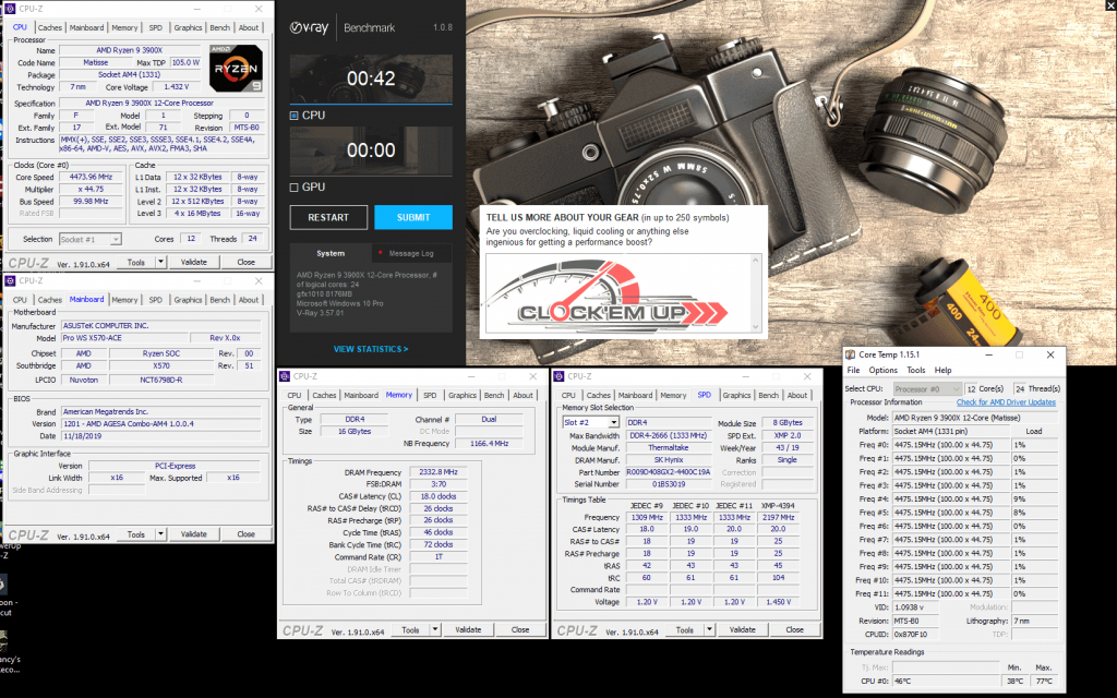 รายละเอียดของชุด System ในการทดสอบครั้งนี้ เราก็จะเน้นไปที่เรื่องของการ Overclock CPU และแรม DDR4 บนเมนบอร์ดรุ่นนี้เลยก็แล้วกัน ซึ่งจากที่ผมลองเล่นดูแล้ว พบว่าภาคจ่ายไฟเมนบอร์ดรุ่นนี้ทำออกมาได้ดีมากๆ โดยสามารถที่จะขับ CPU AMD Ryzen 9 3900X 12C/24T ให้วิ่งเต็มความเร็วทุกคอร์ ที่ทำการ Overclock ไว้ที่ 4.475Ghz All Core ด้วยไฟเลี้ยง 1.4325V ได้อย่างมีเสถียรภาพดีระดับหนึ่งได้เลยนะครับ วึ่งปกติแล้ว CPU ตัวนี้จะทดสอบผ่านได้เกิน 4.45Ghz+ ได้ยากมาก แต่สำหรับเข้า Pro WS X570-ACE ตัวนี้กลับทำได้ดีมากเลยทีเดียว ดั้งนั้นใครเอาไว้ใช้ทำงานสาย WorkStation แบบยาวๆ 24/7 มั่นใจได้ถึงคุณภาพของภาคจ่ายไฟทั้ง 12+2 Phage IR3555 ชุดนี้ได้เลยครับ เพราะการทำงานทั่วไปนั้นไม่ได้มีการ Overclock ที่หนักแบบนี้อยู่แล้ว…. หรือใครอยากจะลองลากดูก็เชิญครับ ^^”