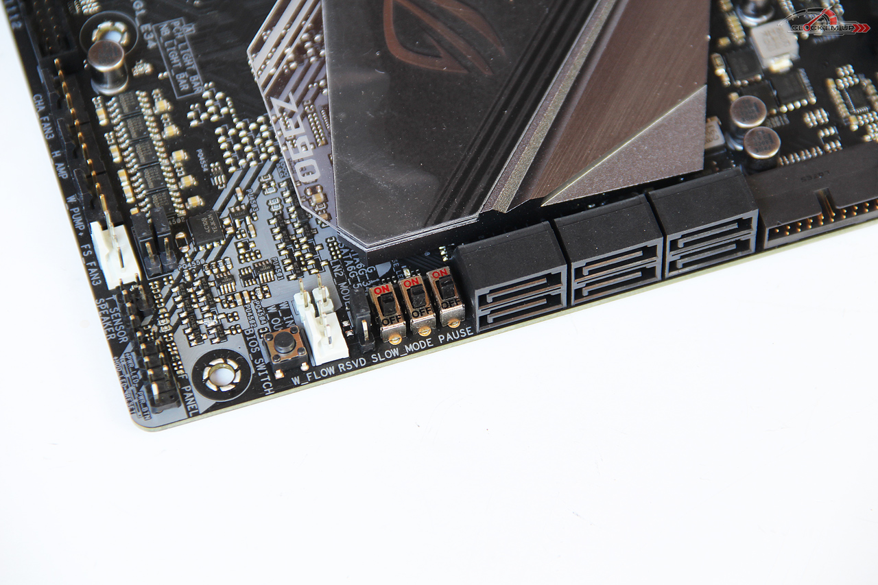 ส่วน LN2 Jumper/RSVD/Pause/SLOW Mode/BIOS Switch นั้นจะย้ายมาบริเวณด้านล่างเมนบอร์ด ติดอยู่กับช่องเสียบ SATA 3.0 6Gb/s ที่มีมาให้ทั้งหมด 6 ช่องครับ รองรับการต่อใช้งานแบบ RAID 0, 1, 5 และ 10 โดยทั้งหมดควบคุมตรงจากทางชิปเซ็ต Intel Z390 PCH