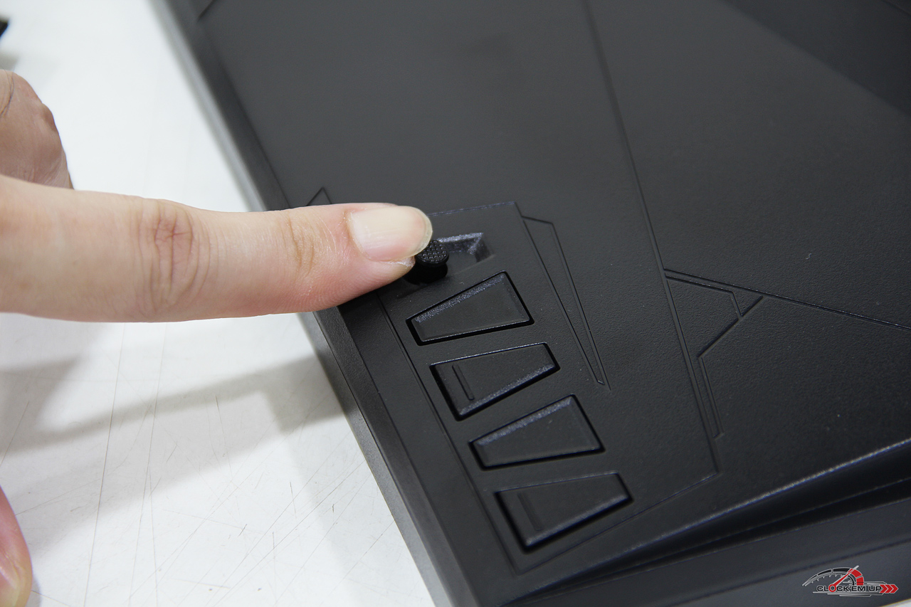 ปุ่มกดปรับแต่งจอภาพต่างๆ จะเป็น Panel ให้กดอยู่ที่บริเวณมุมด้านขวาของจอภาพ โดยจะซ่อนปุ่มกดไว้ด้านหลัง โดยมีปุ่มที่เป็น Joystick ปรับโยกได้ เอาไว้ควบคุมตัวเมนนูหลัก และปุ่มต่างๆ ที่เหลืออีก 4 ปุ่มนั้นจะเอาไว้กดปุ่มการทำงานลัดที่สำคัญอย่างเช่น X Button เอาไว้กดเพื่ออกจากเมนูต่างๆ, GamePlus Menu, Game Visual Function, และปุ่มล่างสุดคือ Power Swich เอาไว้เปิด/ปิดจอภาพครับ