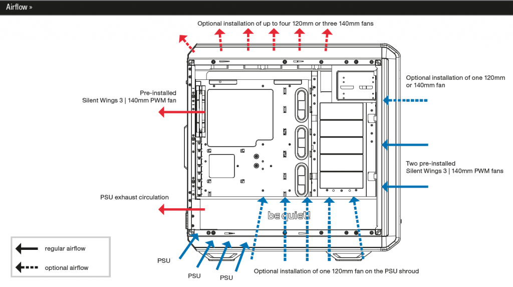 ตัวอย่างการวางระบบ Air-Flow ของตัว Case ที่ได้จากการใช้พัดลมดูดและเป่าออก โดยจะเน้นการดูดอากาศเย็นเข้าจากด้านหน้าและด้านล่าง Case และดูดลมร้อนออกจากทางด้านหลังและด้านบนตัว Case ครับ