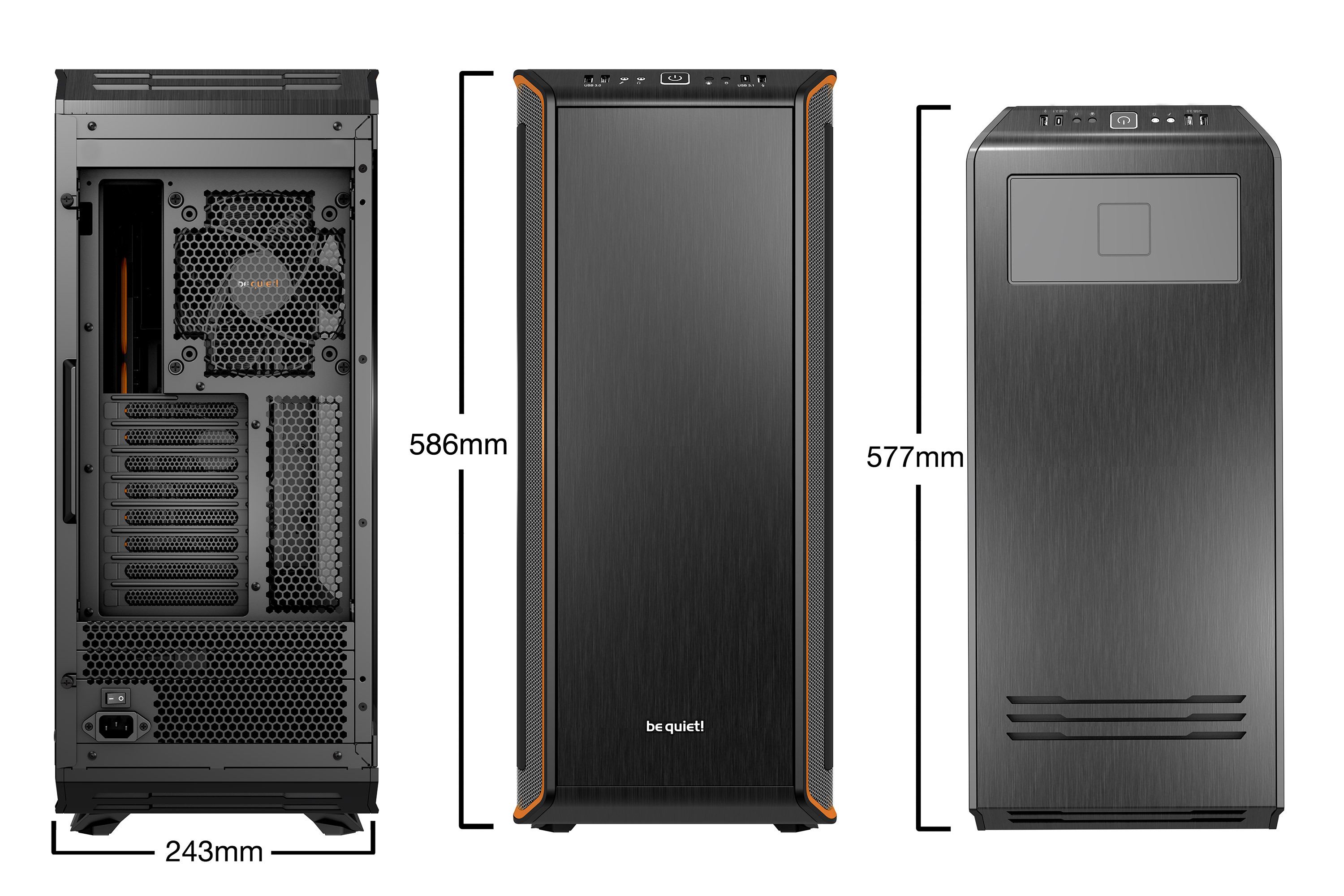 มาดูขนาดความสูงในแต่ละด้านของ Case รุ่นนี้กันเลยครับ โดยมันเป็น Case แบบ Full Tower ที่มีความสูงที่สุดจากฐานด้านล่างสุดขึ้นไปด้านบนอยู่ที่ 586mm. หน้ากว้างของของ Case อยู่ที่ 243mm. และความลึกของตัว Case อยู่ที่ 577mm. ครับ ดูแล้วก็สมส่วนดีนะสำหรับ Case ขนาด Full Tower