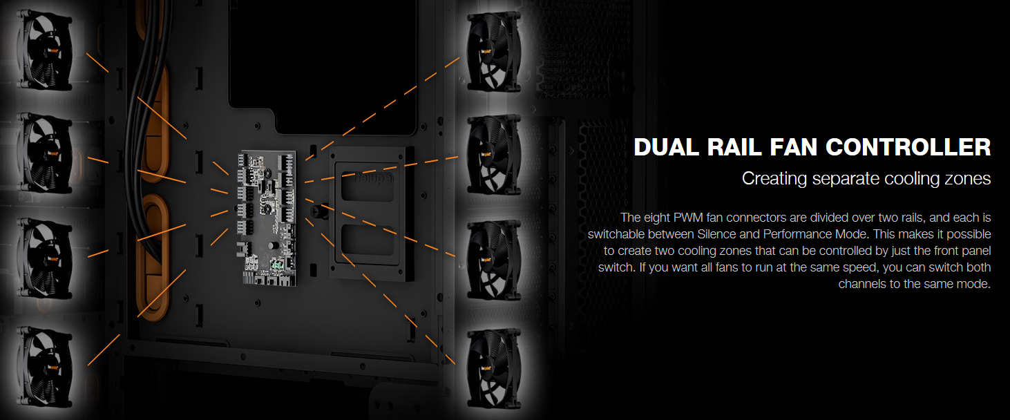 - Stepless dual-rail fan controller is switchable between Silence and Performance modes