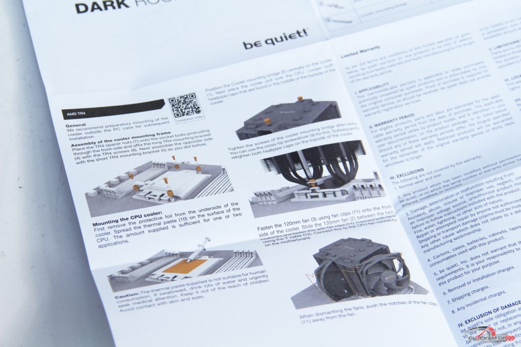 แกะกล่องดูของด้านในกันเลยครับว่ามีอะไรอยู่บ้าง จากที่ผมเห็นอยู่นี้ อุปกรณ์และชิ้นส่วนหลักๆ นั้นแทบจะเหมือนกับ DARO ROCK PRO4 ทั้งหมด เพียงแต่ว่าในรุ่น DARK ROCK PRO TR4 นั้นก็จะมีเพียงแค่ชุดยึด Mounting ของทาง TR4 Socket ได้เท่านั้น และการออกแบบของตัว Heatsink นั้นก็ยังสามารถรับกับโหลดความร้อนของ CPU ได้สูงสุดจากการออกแบบที่ 250W TDP