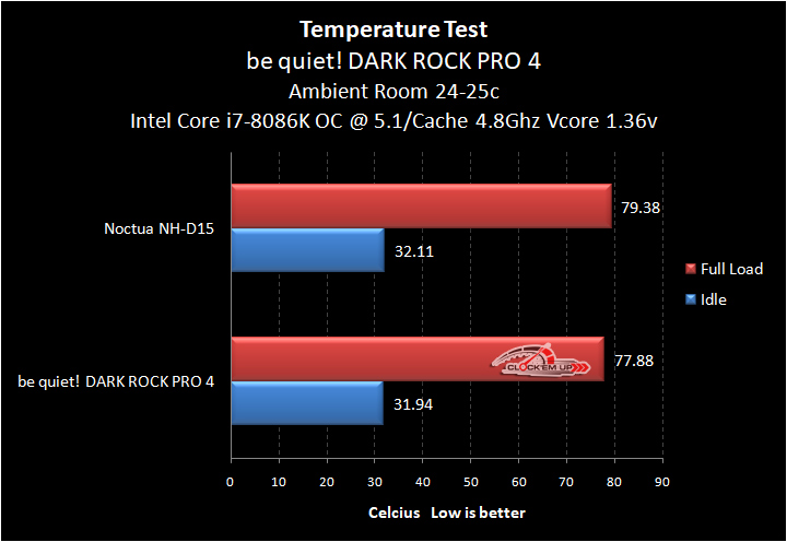 และในช่วงของการ Overclock วัดใจกันต่อว่าใครจะเย็นกว่าใคร ก็พบว่าที่ 5.1Ghz/Cache 4.8Ghz Vcore 1.36V นั้นก็ยังคงเป็น DARK ROCK PRO4 ที่ทำหน้าที่ระบายความร้อนได้ดีกว่า Noctua NH-D15 อยู่ที่ประมาณ 1.5c องศาเซลเซียส จากการทดสอบนี้จึงทำให้เห็นว่า Heatsink ระบายความร้อนทั้ง 2 รุ่นนี้มีประสิทธิภาพที่ใกล้เคียงกันมากเลยทีเดียวในการทดสอบของเรา ทั้งนี้และทั้งนั้น การทดสอบแต่ละรอบอาจจะทำให้ผลการทดสอบเปลี่ยนไปบ้าง แต่ก็อย่างน้อยก็ทำให้เห็นว่าทั้ง 2 รุ่นมีประสิทธิภาพใกล้เคียงกันมากจริงๆ ครับ ^^”