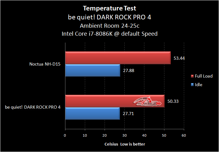 ผลการทดสอบแรกที่ความเร็วเดิมๆ จากโรงานของ CPU Intel Core i7-8086K นั้นช่วง Full Load บนเมนบอร์ดตัวนี้จะทำงานที่ 4.3Ghz ทุกๆ คอร์ ก็ผลออกมาค่อนข้างชัดเจนที่ be quiet! DARK ROCK PRO4 นั้นเย็นกว่าในช่วง Full Load ประมาณ 3.11c องศาเซลเซียส