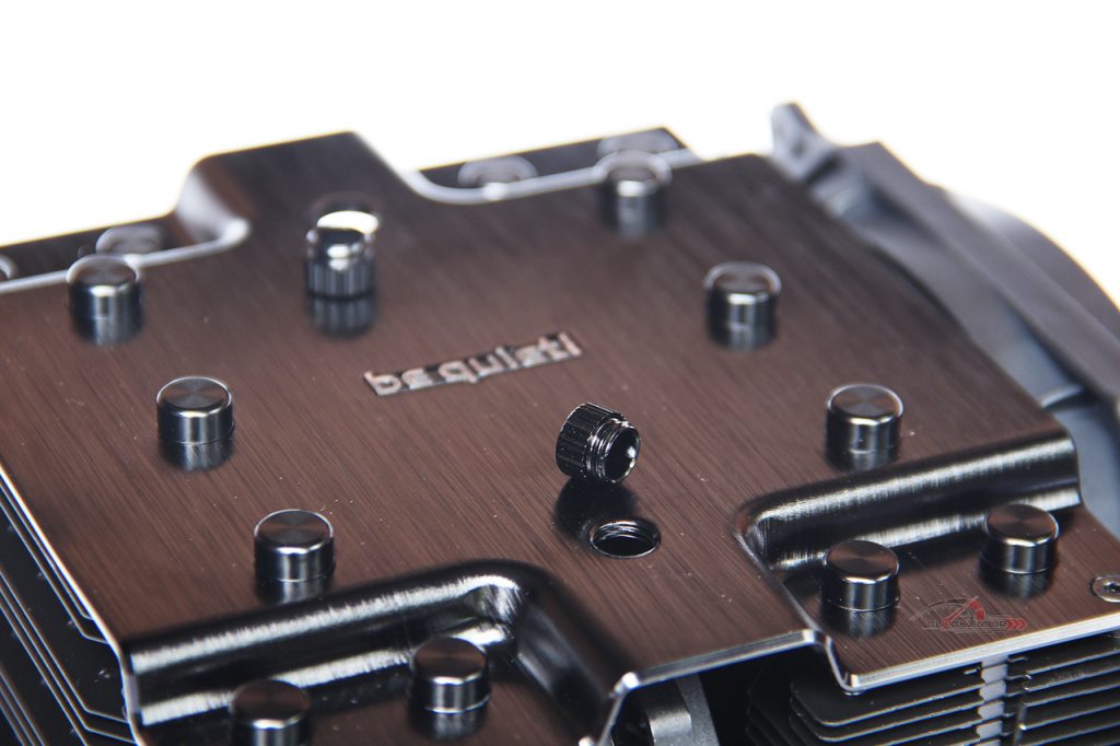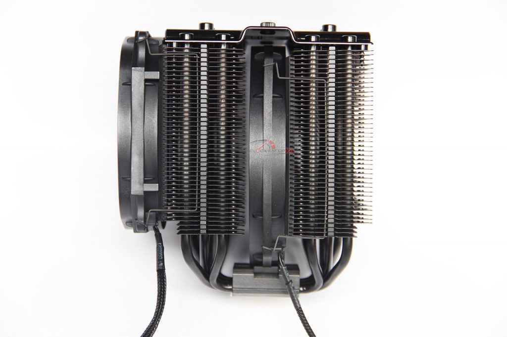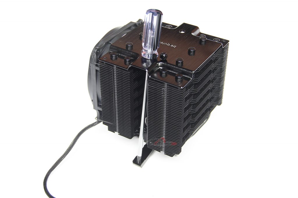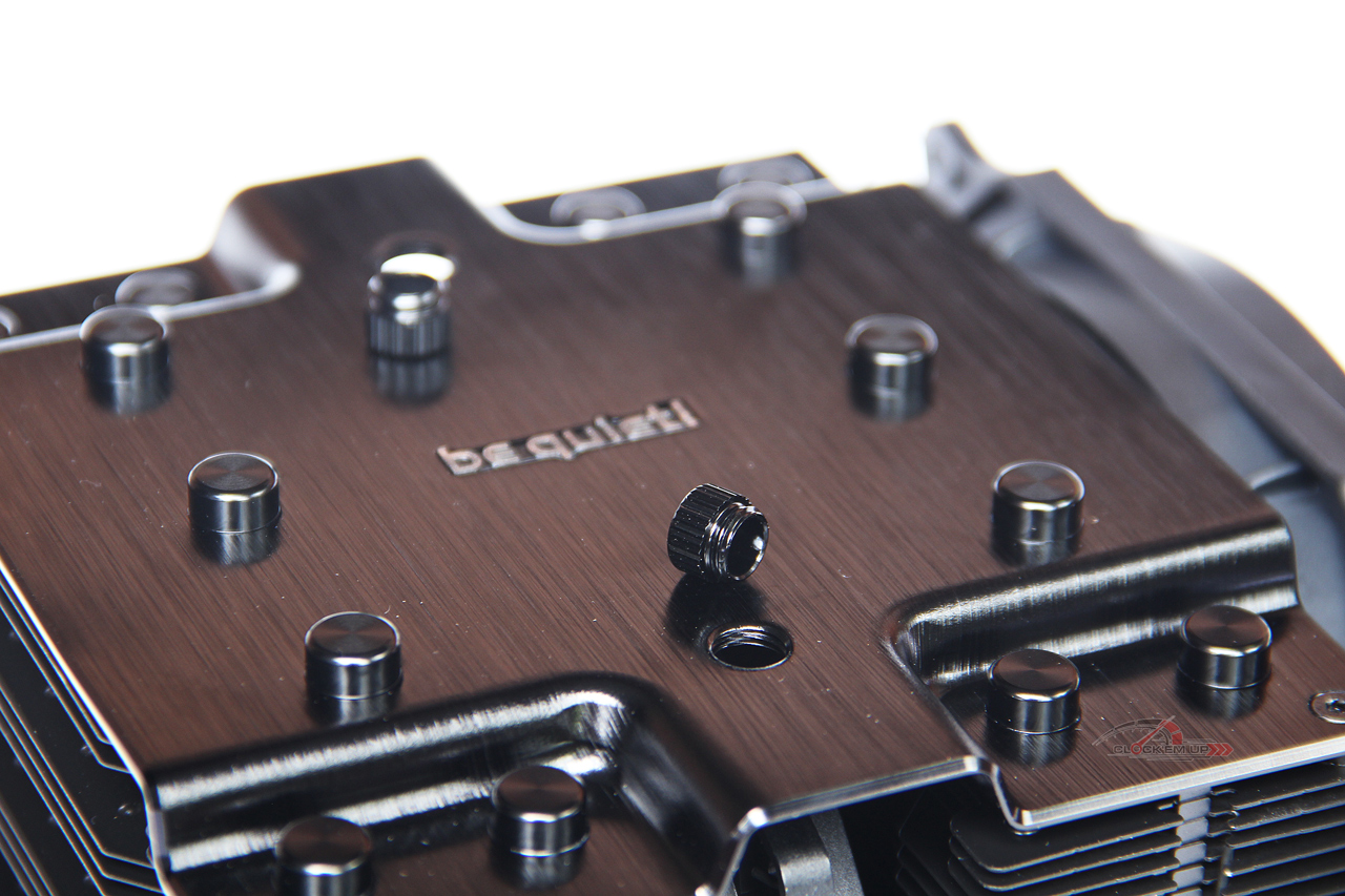 บริเวณด้านบนนั้นจะมีตัว Cover Heatsink ปิดไว้ด้านบน ซึ่งทำออกมาได้อย่างสวยงาม เรียบหรูมากครับ ส่วนเนื้องานนั้นบอกได้เลยว่าทำออกมาได้ค่อนข้างดี โดยเฉพาะตัว Cover นั้นเลือกใช้อลูมิเนียมที่ค่อนข้างหนา โดยชิ้นงานนั้นเขาบอกไว้ว่าใช้เพชรตัดชิ้นงานที่มีความละเอียดเป็นอย่างมาก เพื่อสมกับการเป็น High-End CPU Cooler