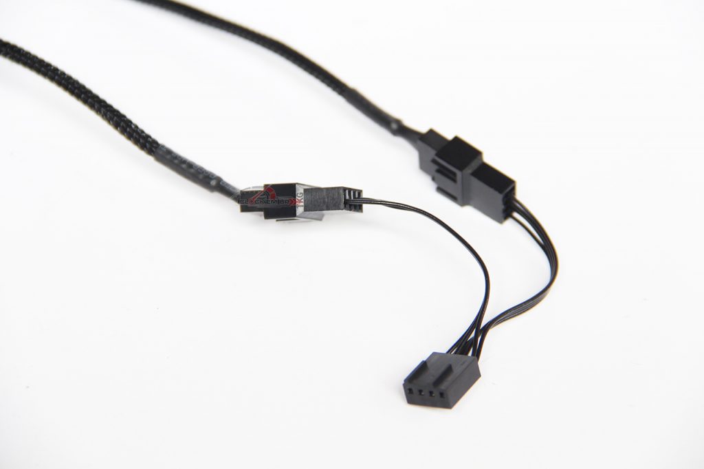 แถมสาย Y-Cable Splitter 2 ทางแบบ 4-Pin PWM สำหรับพัดลม 2 ตัวมาให้เรียบร้อยครับ ไม่ต้องเปลืองช่องเสียบ PWM บนเมนบอร์ด ซึ่งสามารถใช้ช่องเดียวกันได้เลย ดังนั้นการนับรอบของพัดลม จะอิงกับช่องเสียบที่มีสาย 4-Pin เป็นหลักนะครับ เพราะอีกช่องจะเป็น 3 Pin จะนับรอบไม่ได้ ถ้าให้ผมแนะนำก็คือเอาพัดลมตัวแรกที่รอบ 1500rpm. ต่อเข้ากับสายแปลงที่ต่อสายไฟ 4 Pins สำหรับใช้วัดรอบพัดลมตัวดังกล่าวได้เป็นต้น