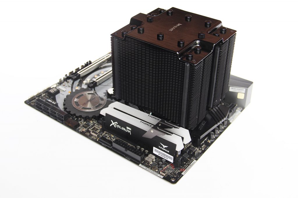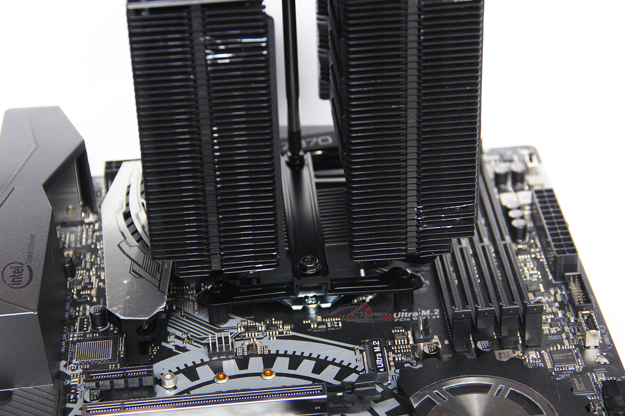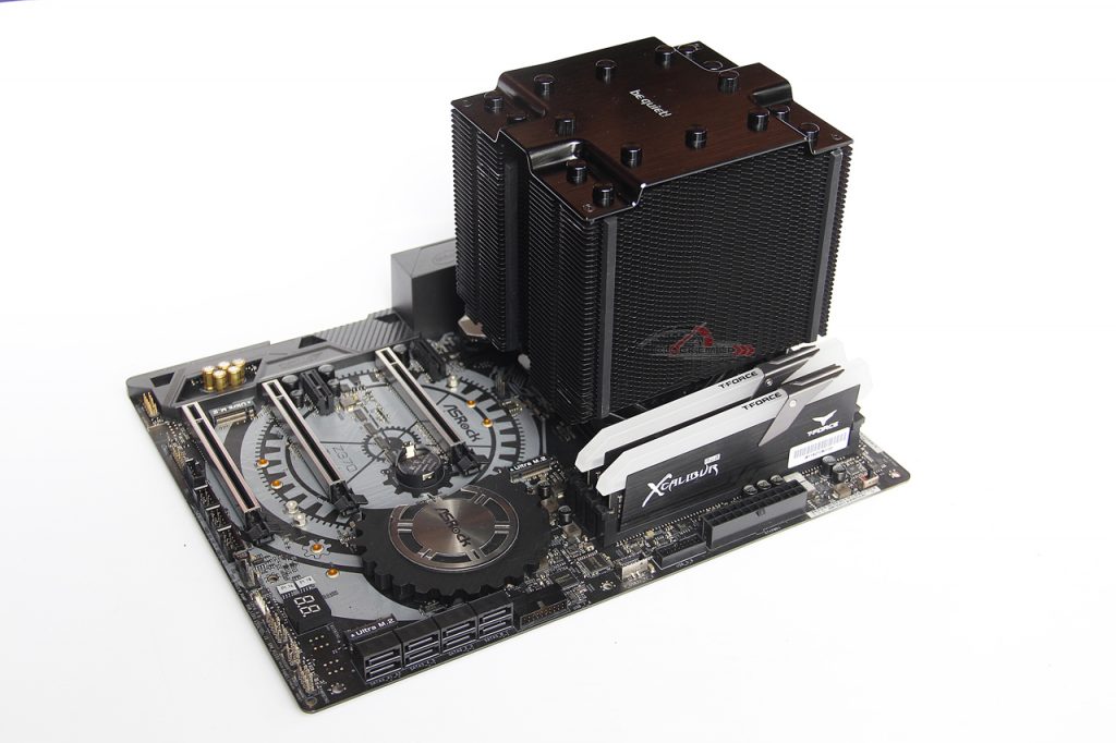 และสิ่งสุดท้ายที่น่าห่วงมากเลยสำหรับ Heatsink รุ่นนี้คือ ความใหญ่โตของมันนั้น ทำให้ตัวมันล้นออกมาที่บริเวณ Slot ของแรม DDR4 ถึงแม้ว่าจะออกแบบให้ตัว Heatsink หักหลบเว้นพื้นที่ให้กับ Heatspreader ของแรมให้แล้วก็ตาม แต่ด้วย Design ของแรมในยุคนี้ทำ Sink มาสูงกันเหลือเกิน… หากต้องการนำมาติดตั้งแบบ 4xDIMM ผมมองว่า อาจจะเป็นไปได้ยากนิดหนึ่ง ถ้าคุณใช้แรมทรงสูงมากๆ แต่ถ้าติดตั้งแบบ 2xDIMM แบบตัวอย่างที่เราทดสอบ ก็ไม่น่าห่วงอะไรครับ เพราะอย่างน้อยก็ยกพัดลมหลบขึ้นไปด้านบน Heatspreader ของแรมได้ อย่างเช่นในรุ่น T-Force XTREEM DDR4, T-Force Xcalibur RGB, T-Force NightHawk RGB/LED และ Klevv CRAS II นั้นก็ยังสามารถติดตั้งร่วมกับเมนบอร์ด ASROCK Z370 Taichi ได้แบบ 2xDIMM ครับ ดังนั้นเช็ค Layout เมนบอร์ดและความสูงของ Heatspreader แรมก่อนที่จะคิดนำมาประกอบร่วมกัน เพราะไม่อยากให้ซื้อมาแล้ว ใส่ของร่วมกันไม่ได้… ติดนู้น ติดนี่ น่าเสียดาย ฮ่าๆ…