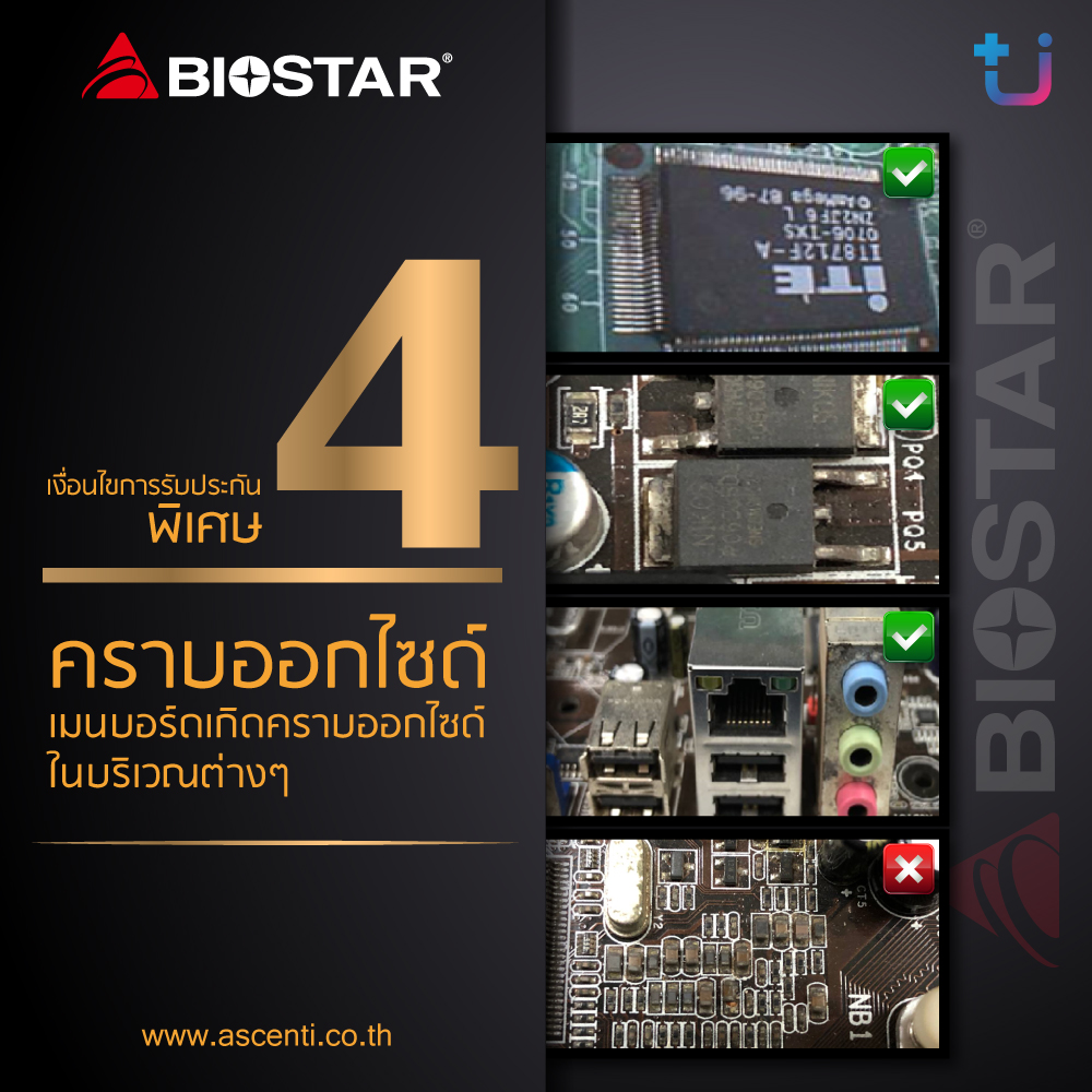 - 3.สินค้ามีการดัดแปลง แก้ไข ซ่อมแซมโดยที่ไม่ได้ผ่านการดูแลจากทาง Biostar หรือ บริษัทฯ ไม่อยู่ในเงื่อนไขการรับประกัน