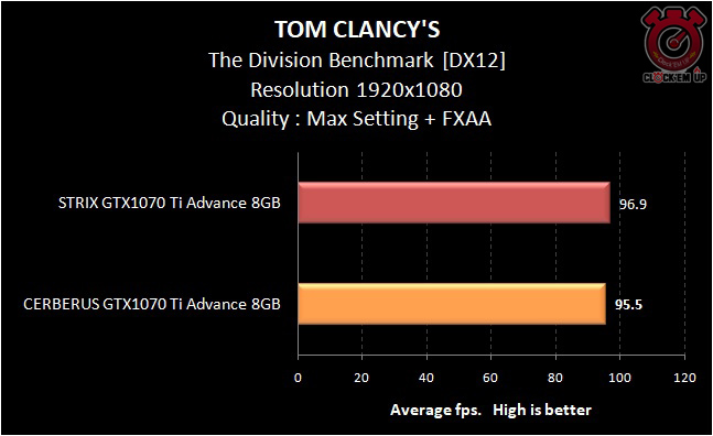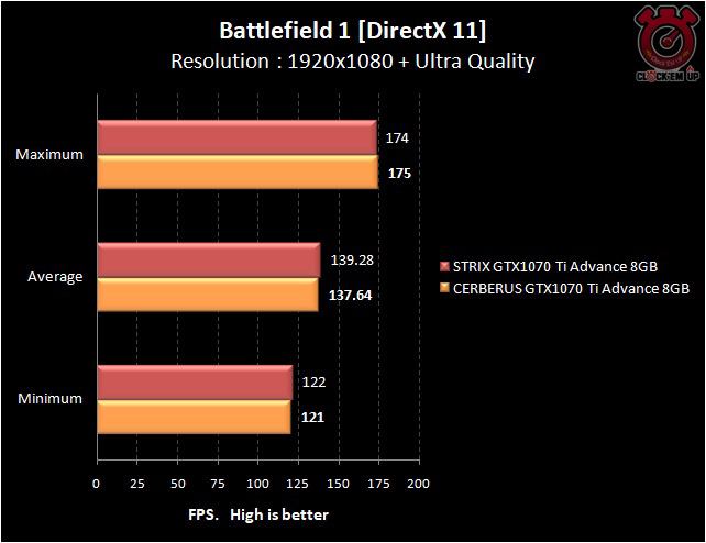 มาชมถึงประสิทธิภาพจากการเล่นเกมจริงๆ กันเลยดีกว่าครับ โดยครั้งนี้ เราจะเทียบกับการ์ดรุ่นที่ใหญ่กว่าอย่างเจ้า STRIX GTX1070 Ti ADVANCE 8GB กับ CERBERUS GTX1070 Ti ADVANCE 8GB ซึ่งผลการทดสอบในเกม Battlefield 1 ที่ความละเอียด 1080p + Ultra Preset นั้นเราจะเห็นได้ว่าเจ้า CERBERUS GTX1070 Ti นั้นจะเฟรมเรทเฉลี่ย 1-2fps. เท่านั้นครับ ซึ่งจะเป็น Scale แบบนี้ใน 7 เกมทดสอบทั้งหมดครับ ลองพิจารษาดูกันเลยว่าคุ้มค่าหรือไม่กับเงินที่ประหยัดไป เมื่อเทียบกับ STRIX Series และถ้าให้ผมตอบตรงนี้เลย ก็คือตอนเล่นเกม แทบจะไม่รู้สึกหรอกครับ ว่าตัวไหนแรงกว่ากัน แต่ถ้าเก็บผลเป็นตัวเลขออกมาเทียบให้ชม ก็จะพอเห็นได้ว่ามันต่างกัน….