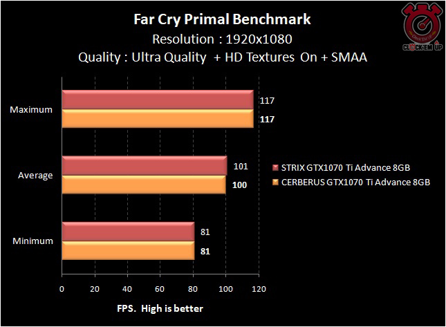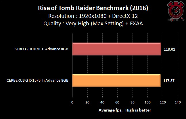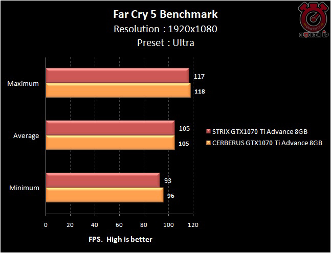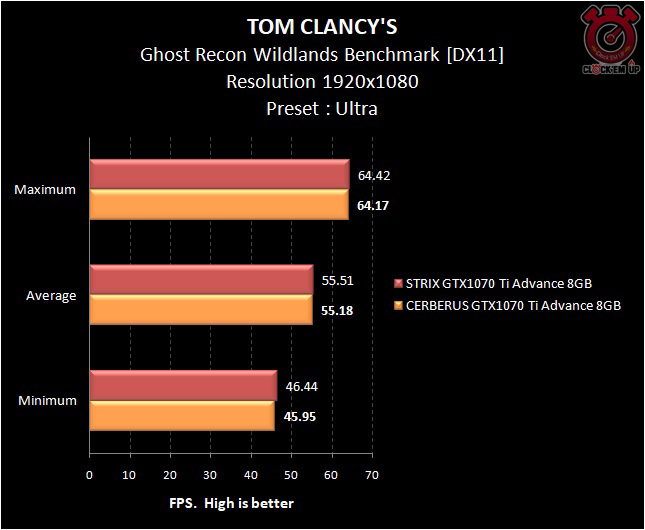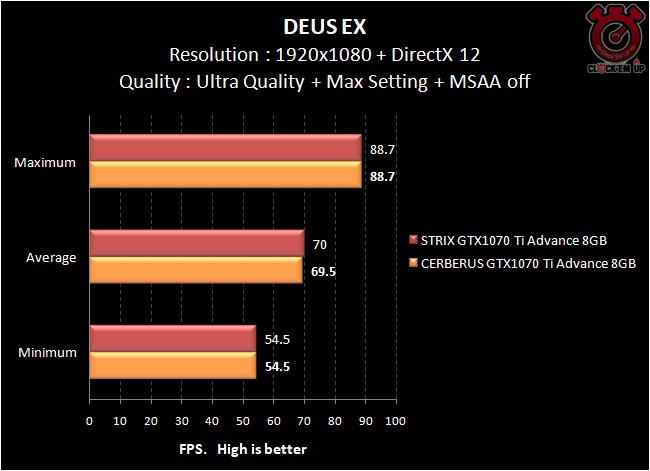 โดยรวมแล้วตอนเล่นเกมนั้นอย่างที่ผมกล่าวไว้ข้างต้นผลการทดสอบเลยครับว่าระหว่าง CERBERUS GTX1070 Ti ADVANCE 8GB และ STRIX GTX1070 Ti ADVANCE 8GB นั้นให้ผลการทดสอบที่ต่างกันเพียงเล็กน้อย กล่าวคือ 1-2fps เฉลี่ยเท่านั้นเอง… เนื่องด้วยที่ว่าในรุ่น STRIX นั้นมีชุดระบายความร้อนที่ดีกว่า จึงสามารถเพิ่มความเร็วจากโรงงานของ GPU Base/Boost ได้สูงกว่าเจ้า CERBERUS แต่ก็เพียงเล็กน้อยเท่านั้นเอง…. สรุปแล้วถ้าเอาคุ้มเงินที่จ่ายออกไป ผมมองว่า CERBERUS GTX1070 Ti ADVANCE 8GB ก็เพียงพอแล้ว แต่ถ้าอยากจัดเต็มรุ่นใหญ่ไฟกระพริบ +AURA Sync RGB 16.8 ล้านสีก็คงต้องเลือก STRIX Series เท่านั้น !!!