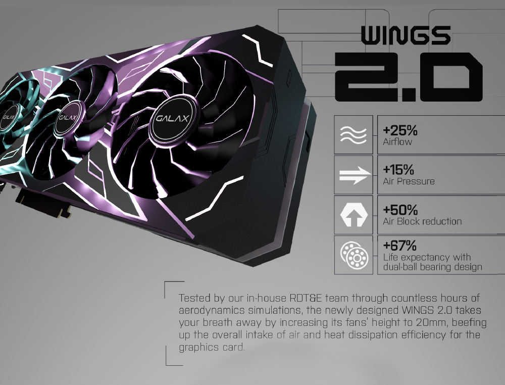 WINGS 2.0 ได้รับการพัฒนาจากทีมพัฒนาให้ประสิทธิภาพด้าน Aerodynamics ให้ดียิ่งขึ้น โดยผลจากการเพิ่มความหนาจาก 15mm เป็น 20mm ทำให้ผลรวมของพัดลมดีอย่างชัดเจน Airflow เพิ่มขึ้น 25%, Air Pressure เพิ่มขึ้น 15%, Air block reduction เพิ่มขึ้น 50% และเลือกใช้ลูกปืนแบบ Dual-Ball Bearing ความทนทานเพิ่มขึ้น 67%