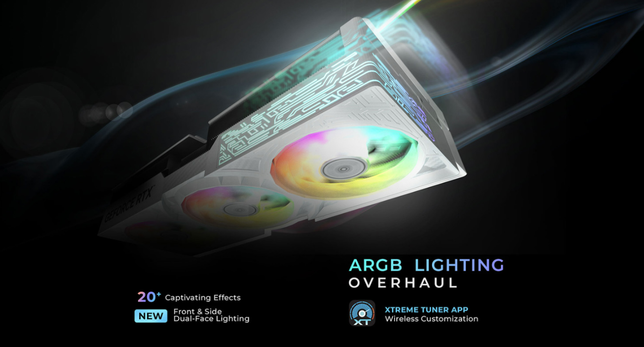 ภายนอกการ์ดจอโชว์ไฟแบบ Dual-Face Lighting ที่ให้แสงไฟ ARGB Lighting Overhaul สีสันที่โดดเด่นเพื่อเกมเมอร์ระดับพรีเมียม ที่ปรับแต่งเอฟเฟกต์ไฟได้มากกว่า 20 รูปแบบได้ทั้งด้านหน้าและด้านข้างของการ์ดจอ เพิ่มความโดดเด่นในทุกมุมมอง