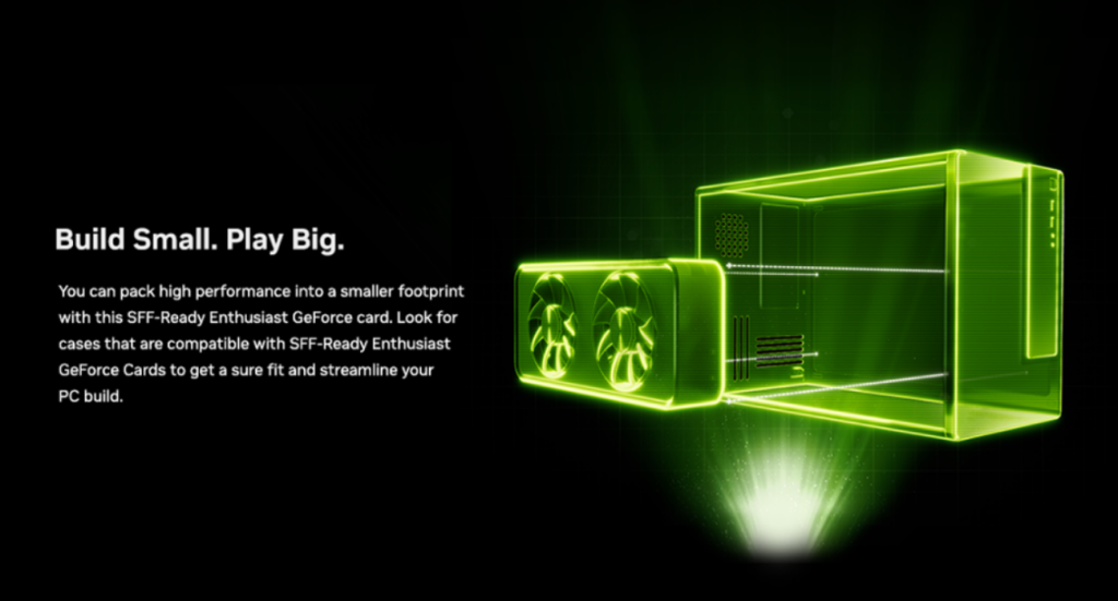 GALAX GeForce RTX™ 5080 1-Click OC ปรับโฉมใหม่ในแนวคิด Build Small. Play Big รับรอง SFF-Ready Enthusiast GeForce Card การ์ดจอที่ออกแบบมาให้เหมาะกับเคสขนาดเล็ก (Small Form Factor) กับขนาด Slot การ์ดจอเพียง 2.5 ช่อง ช่วยให้เป็นตัวเลือกและแนวทางประกอบพีซีที่หลากหลายมากขึ้น แต่ยังคงไว้ซึ่งพลังและประสิทธิภาพระดับสูงสุด